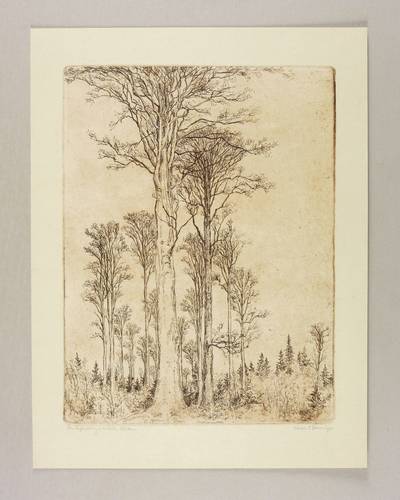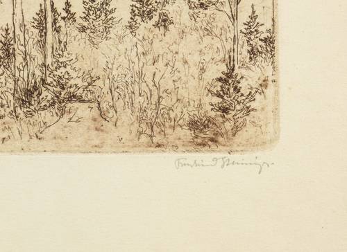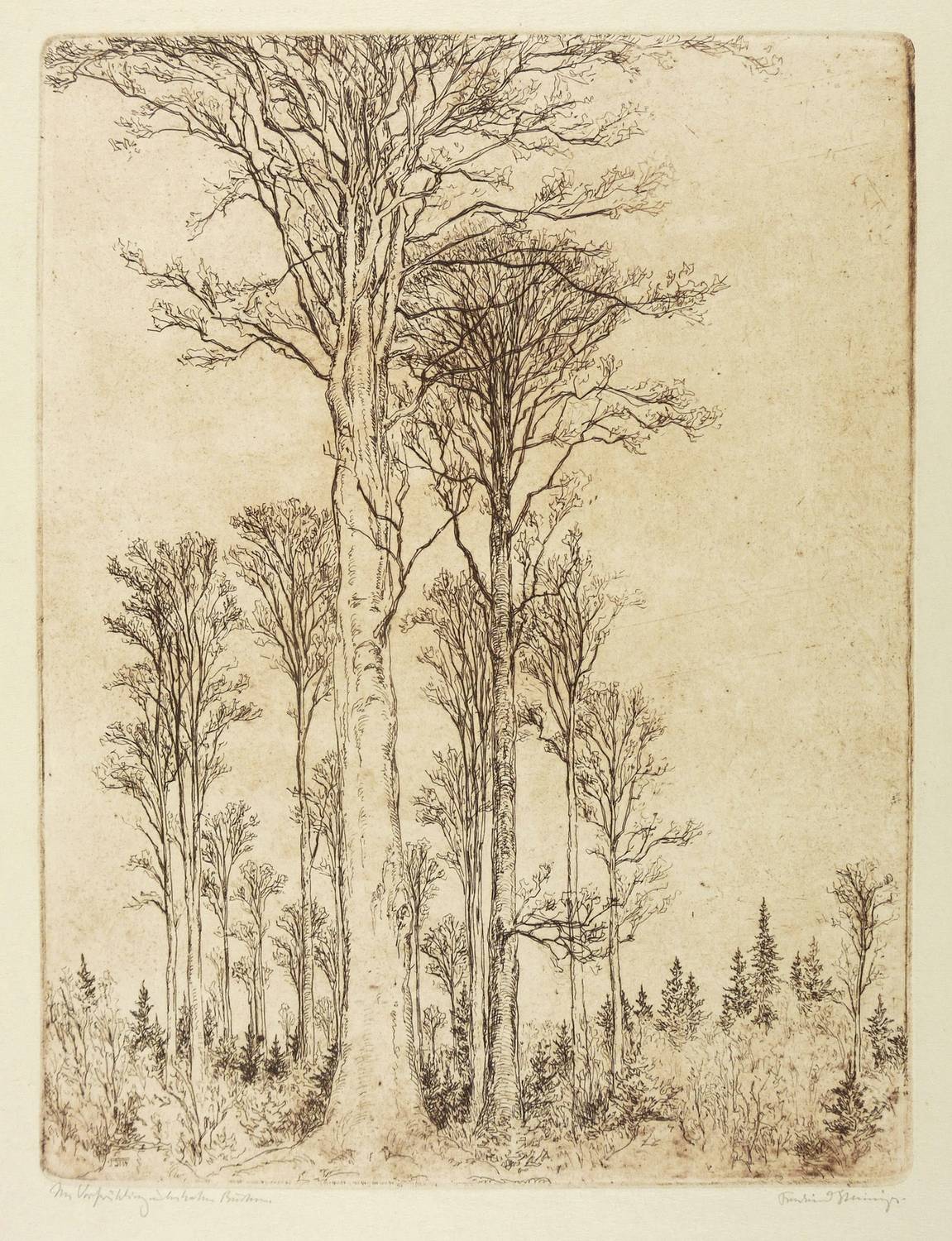 Rechts unten in Bleistift signiert: ″Ferdinand Steiniger.″ Links Titel: ″Im Vorfrühling unter hohen Buchen.″ In der Platte links unten Monogramm und Jahr: ″FST 34″. – Sehr guter Zustand.