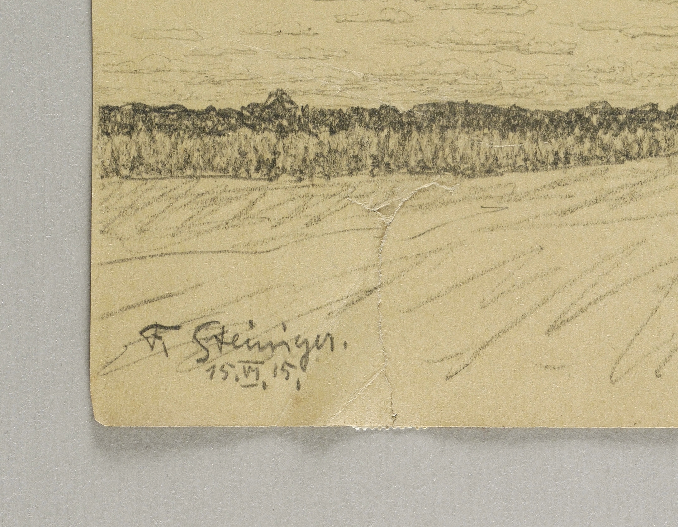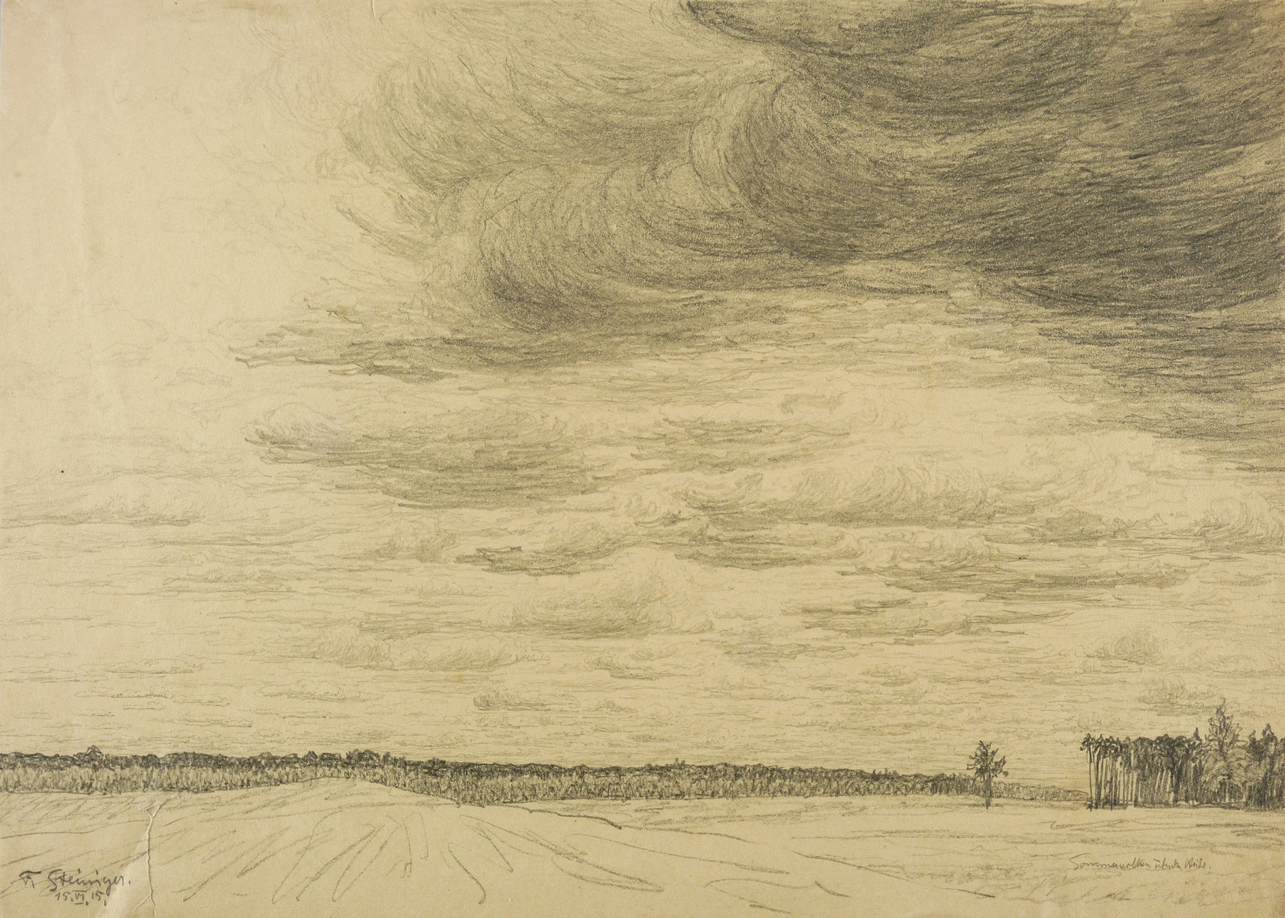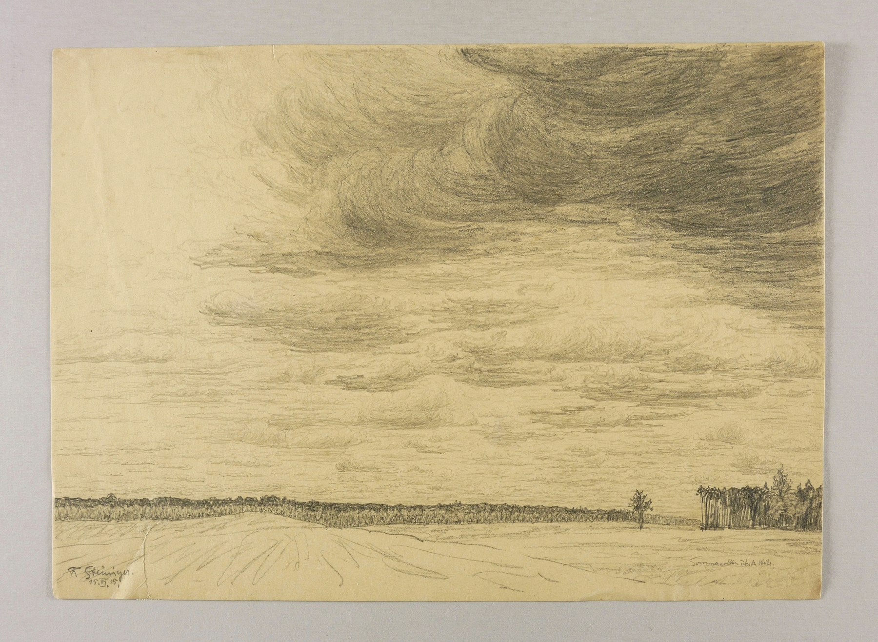 Links unten in Bleistift signiert und datiert: ″F. Steiniger 15. VI. 15.″ Rechts bezeichnet: ″Sommerwolken über der Heide″. – Randriss links unten alt hinterlegt. Leichte Alterspuren. Sonst guter Zustand.