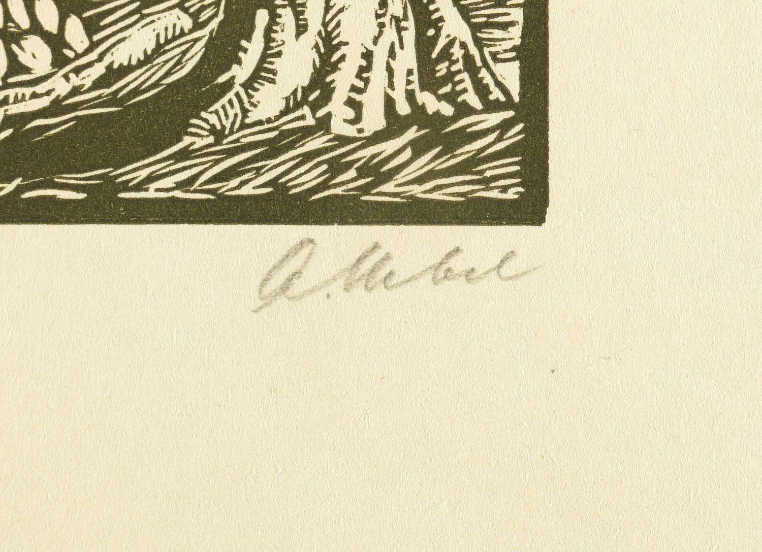 Um 1930. Linolschnitt, in Schwarz, auf leichtem gelbem Velin. – Originale Künstlergrafik, von Alfred Uebel. – Unikat. – 13,2 x 9,3 cm (Darstellung / Druckstock), 23 x 19 cm (Blatt).