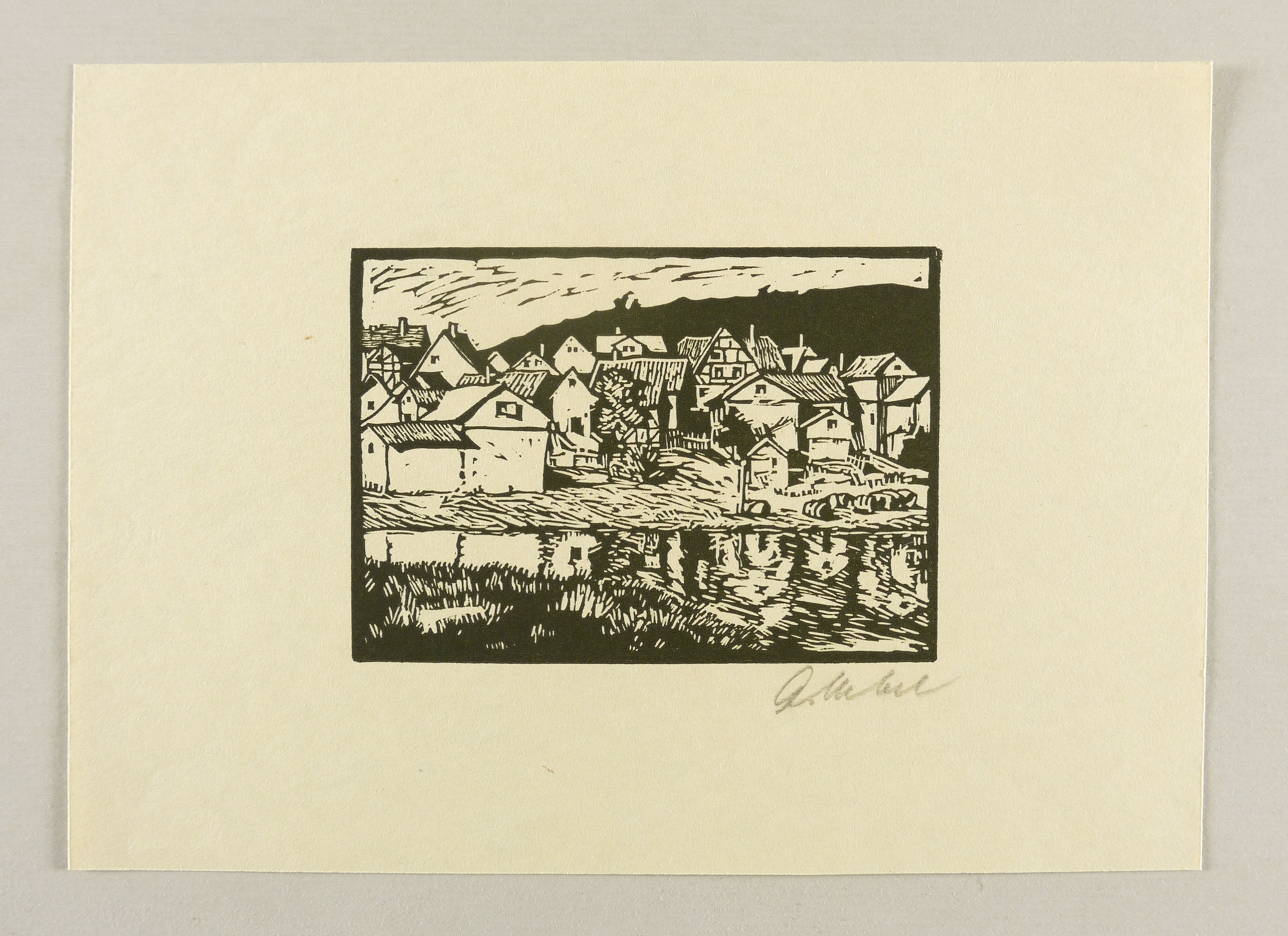 Um 1930. Linolschnitt, in Schwarz, auf leichtem gelbem Velin. – Originale Künstlergrafik, von Alfred Uebel. – Unikat. – 9,4 x 13,3 cm (Darstellung / Druckstock), 19 x 26 cm (Blatt).