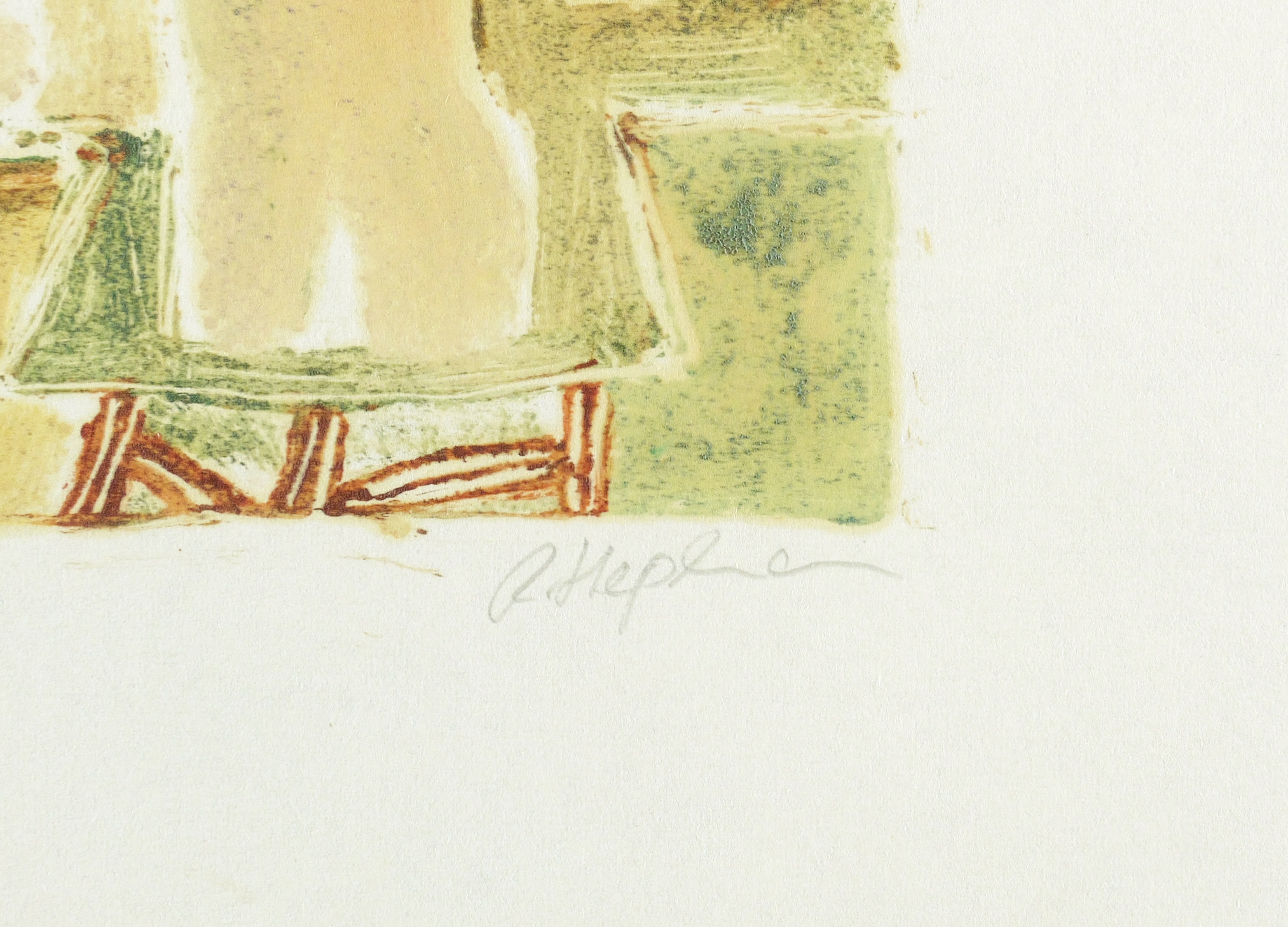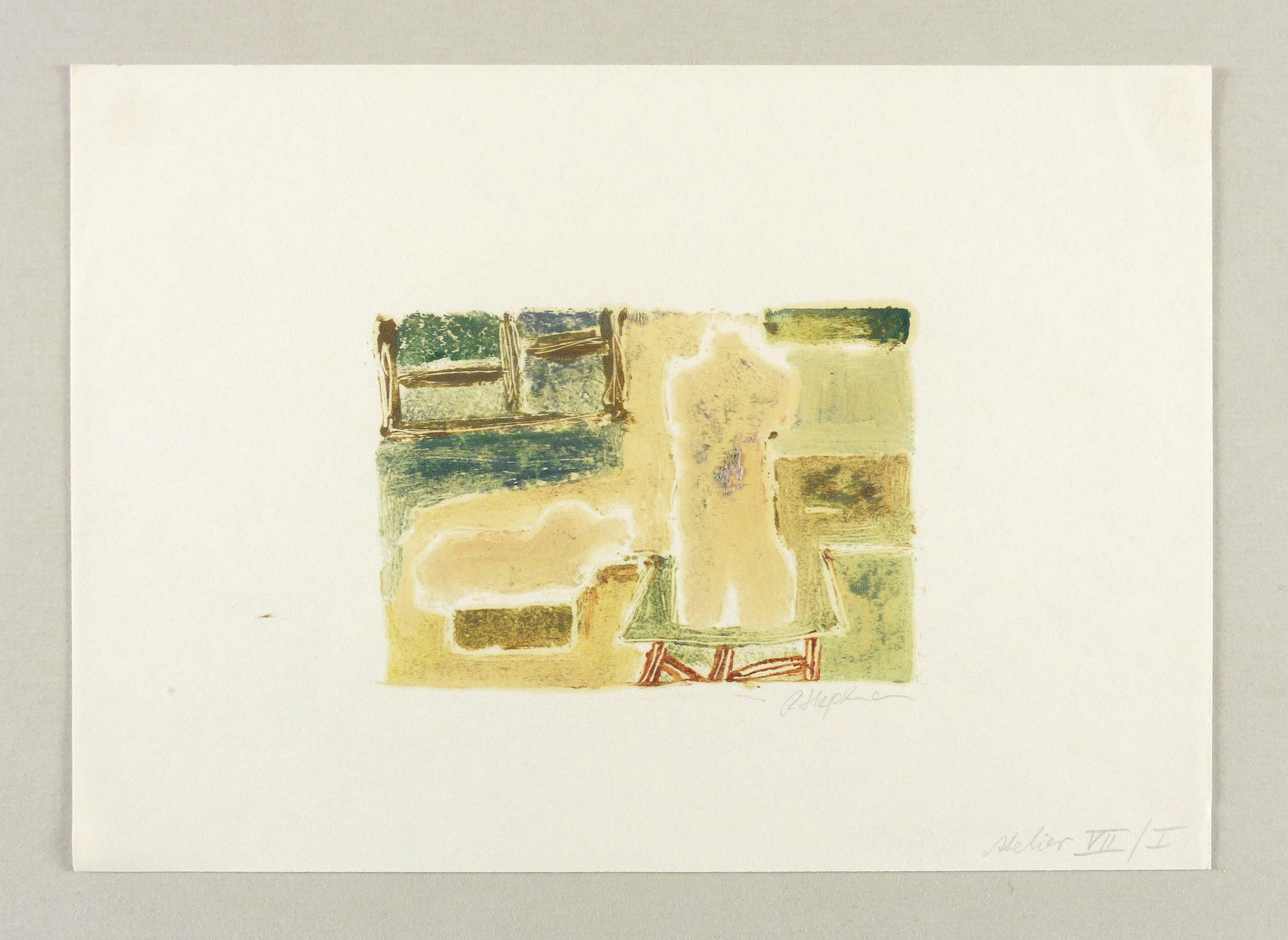 Um 1980. Farbmonotypie, in 5 Farben, auf hellchamois Velin. – Originale Künstlergrafik, von Rosemarie Stephan (Julia). – Unikat. – 22 x 30 cm (Blatt), 10,0 x 14,0 cm (Darstellung / Druckbild).
