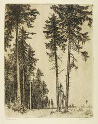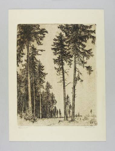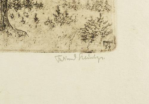 Rechts unten in Bleistift signiert: ″Ferdinand Steiniger.″ Links Titel: ″Fichtenhochwald.″ In der Platte links unten Monogramm und Jahr: ″FST 37″. – Sehr guter Zustand.