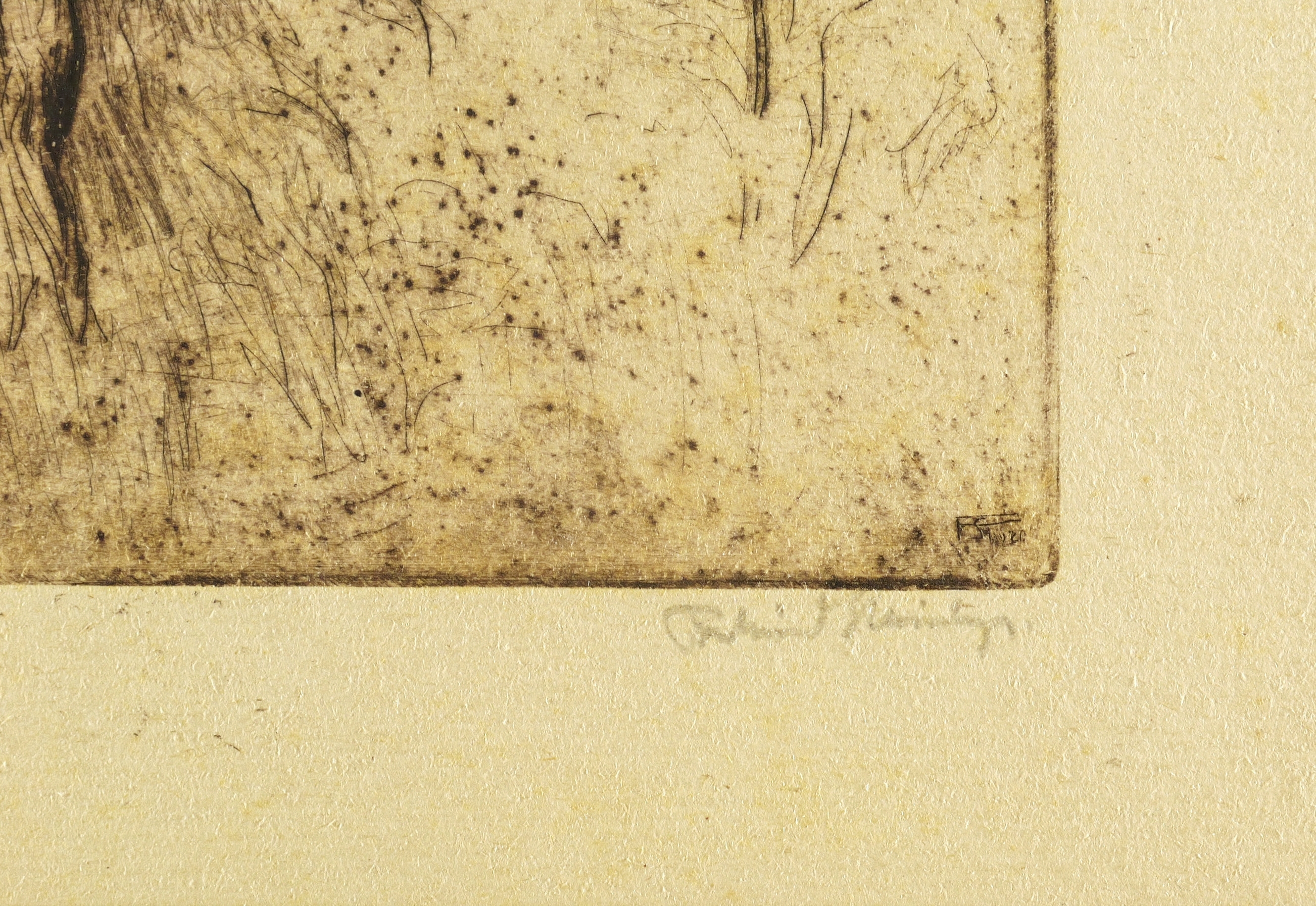 Rechts unten in Bleistift signiert: ″Ferdinand Steiniger″. Links betitelt: ″Einsame Eichen″. In der Platte rechts unten Monogramm und Jahr: ″FSt 1920″. – Sehr guter Zustand.