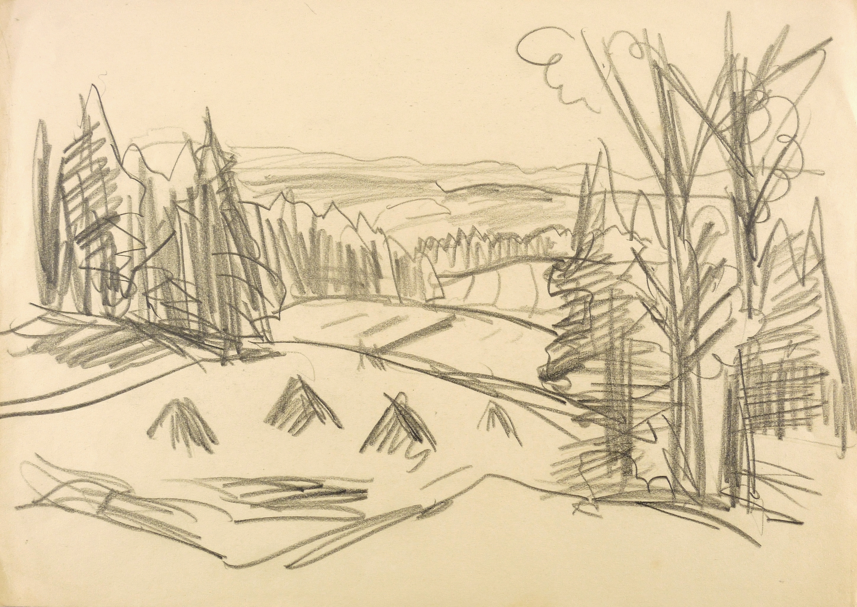 1945-1955. Zeichnung / Graphit, auf gelbem Velinkarton. – Originale Künstlergrafik, von Alexander Wolfgang. – Unikat. – 29,7 x 42,0 cm (Darstellung / Blatt).