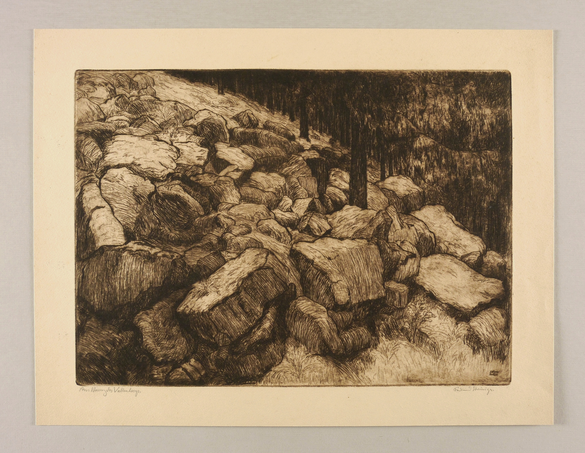 Rechts unten in Bleistift signiert: ″Ferdinand Steiniger.″ Links Titel: ″Am Hang des Valtenbergs.″ In der Platte rechts unten Monogramm und Jahr: ″FST 38″. – Sehr guter Zustand.