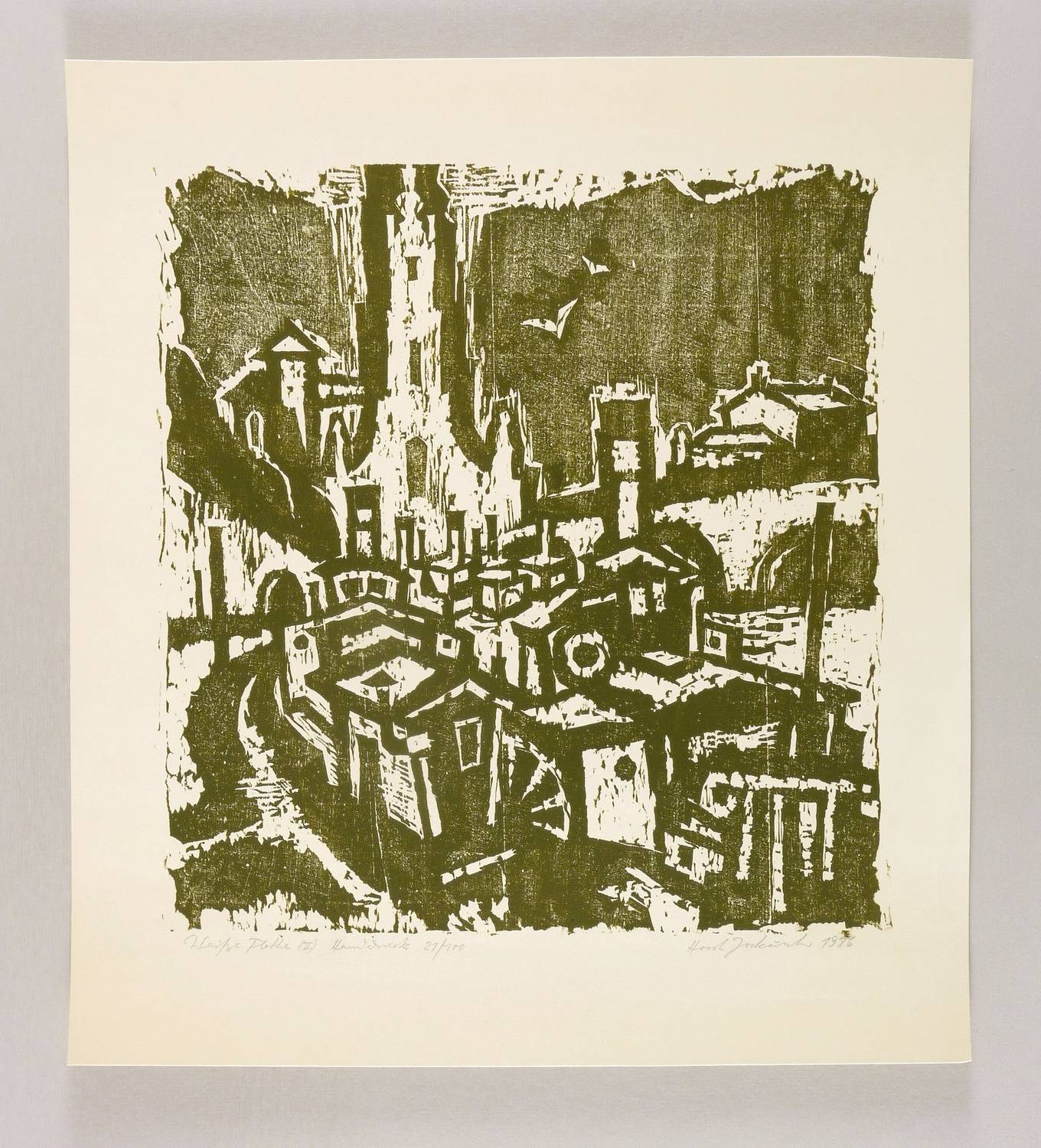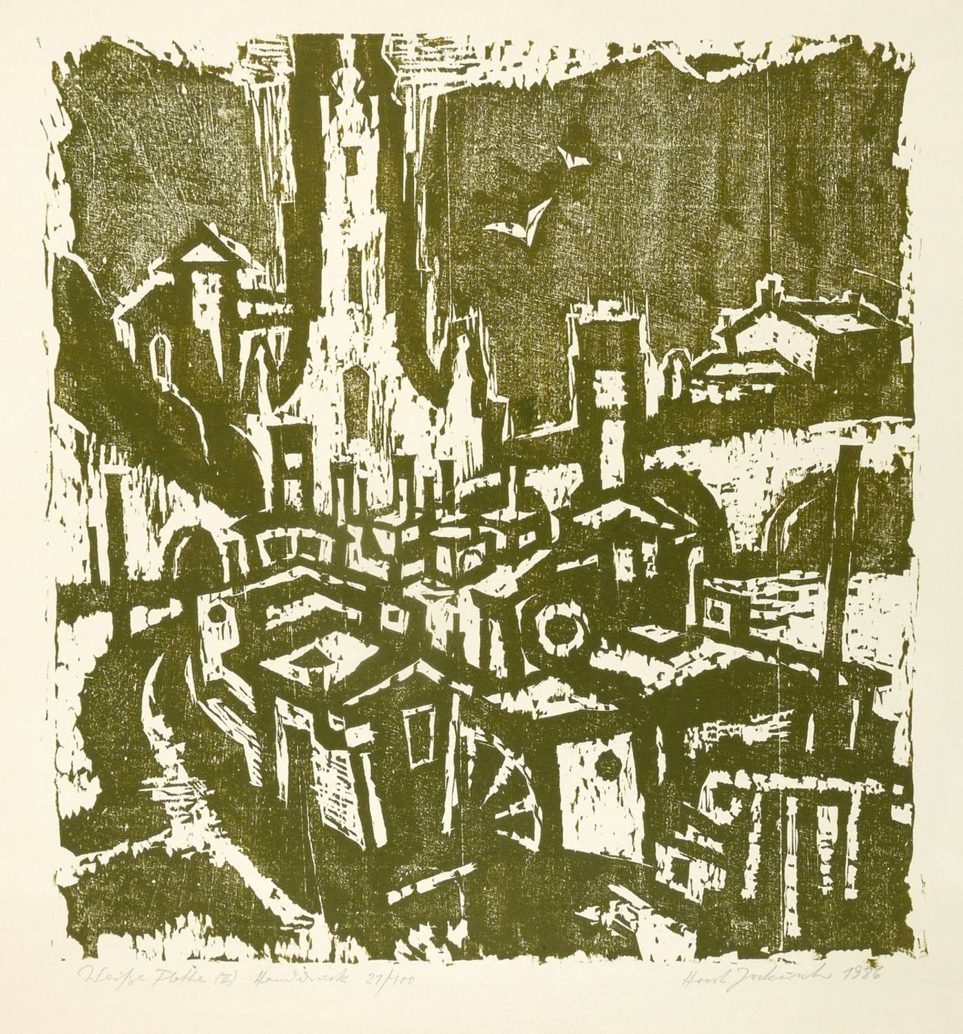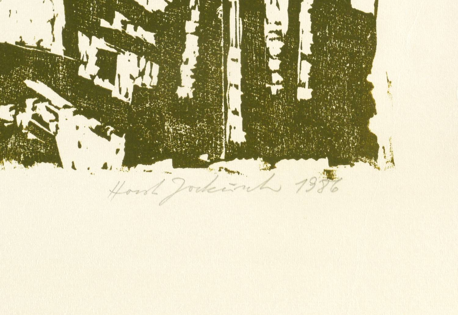 1986. Holzschnitt, in Dunkelgrüngrün, auf hellgelbem Maschinenbütten. – Originale Künstlergrafik, von Horst Jockusch. – Auflage Exemplar Nr. 21/100. – 37,8 x 35,5 cm (Darstellung / Druckstock), 49 x 45 cm (Blatt).