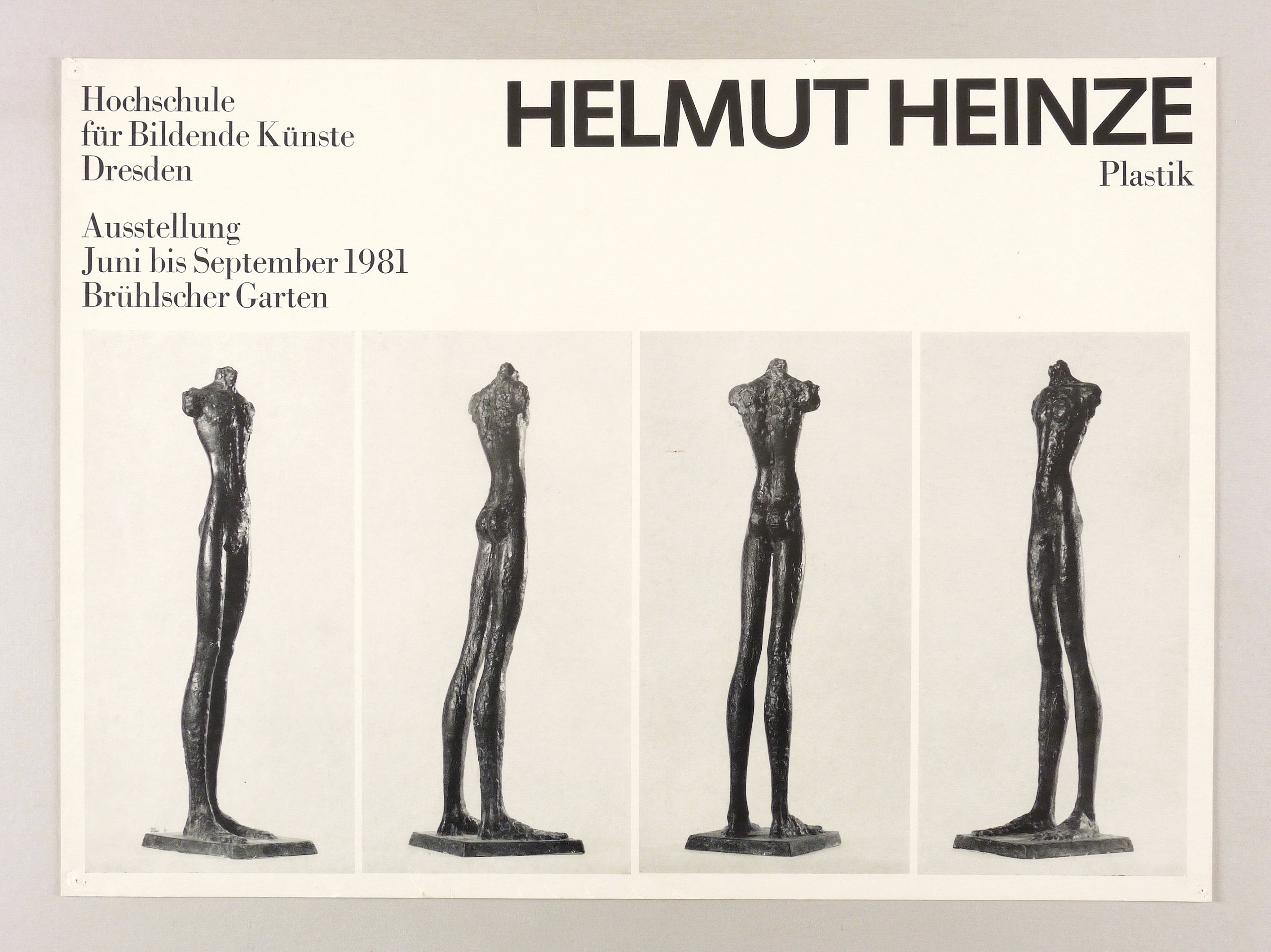 Nicht handsigniert. – Plakat zur Ausstellung ″Helmut Heinze. Plastik″ Juni bis September 1981 Hochschule für Bildende Künste Dresden. – Provenienz: Sammlung Gerlint Söder & Erhard Frommhold, Dresden. – In den Blattecken Reißzwecklöchlein. Mäßig guter Zustand.