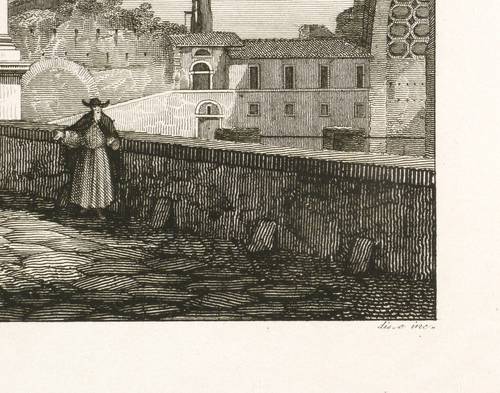 Aus: Gaetano Cottafavi, Raccolta delle Principali Vedute di Roma e suoi Contorni. Disegnate dal vero ed incise da Gaetano Cottafavi (Rom: Tommaso Cuccioni 1837). – In der Platte unterhalb der Darstellung links und rechts signiert: ″G. Cottafavi dis. e inc.″ Unterhalb der Darstellung betitelt. – Sehr guter Zustand.