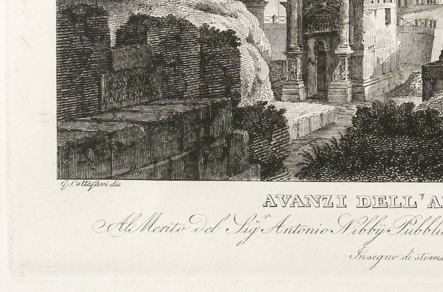Aus: Gaetano Cottafavi, Raccolta delle Principali Vedute di Roma e suoi Contorni. Disegnate dal vero ed incise da Gaetano Cottafavi (Rom: Tommaso Cuccioni 1837). – In der Platte unterhalb der Darstellung links und rechts signiert und datiert: ″G. Cottafavi dis. e inc. Roma 1837.″ Darunter Titel, eine Widmung an Antonio Nibby und Verlegeradresse. – Sehr guter Zustand.
