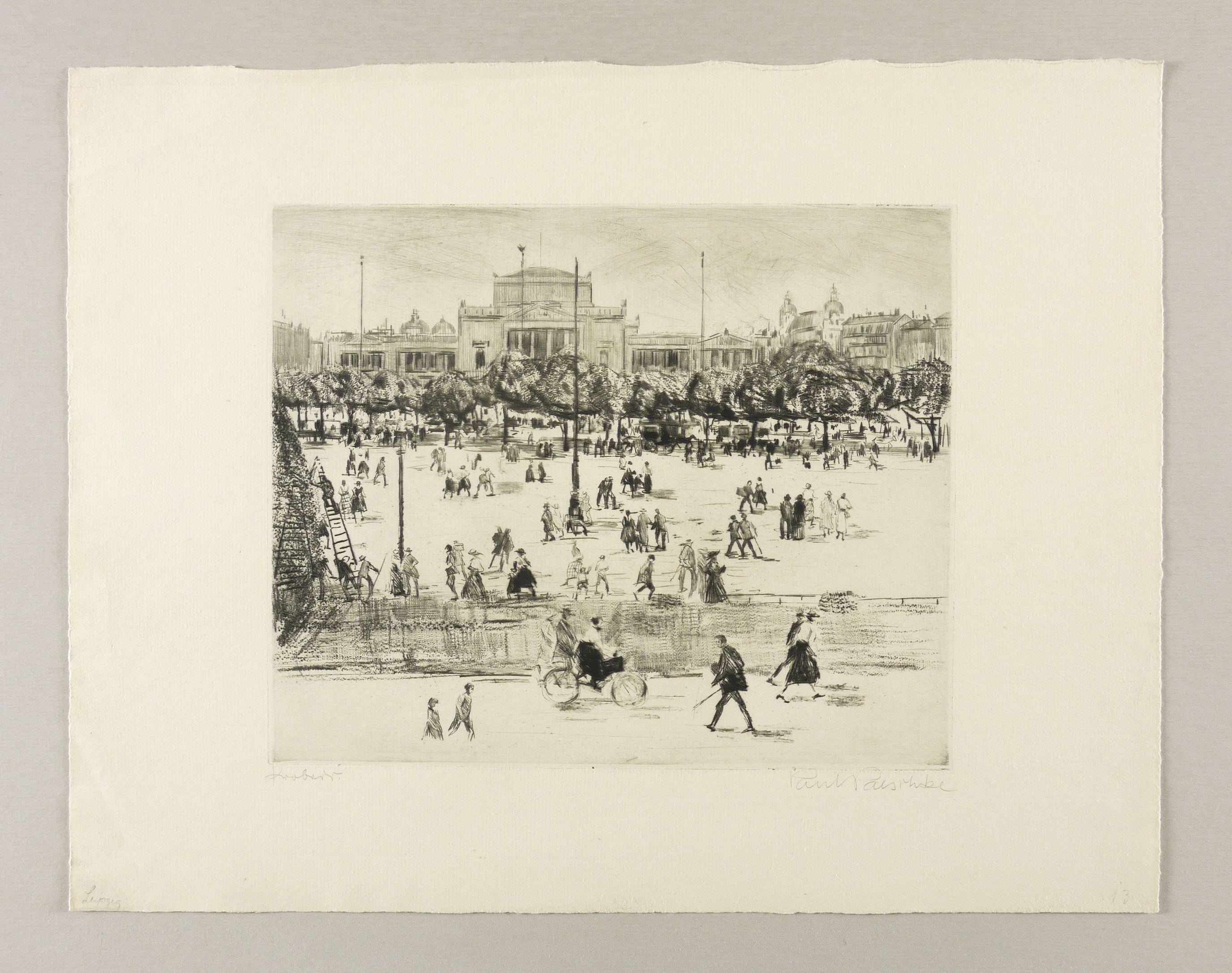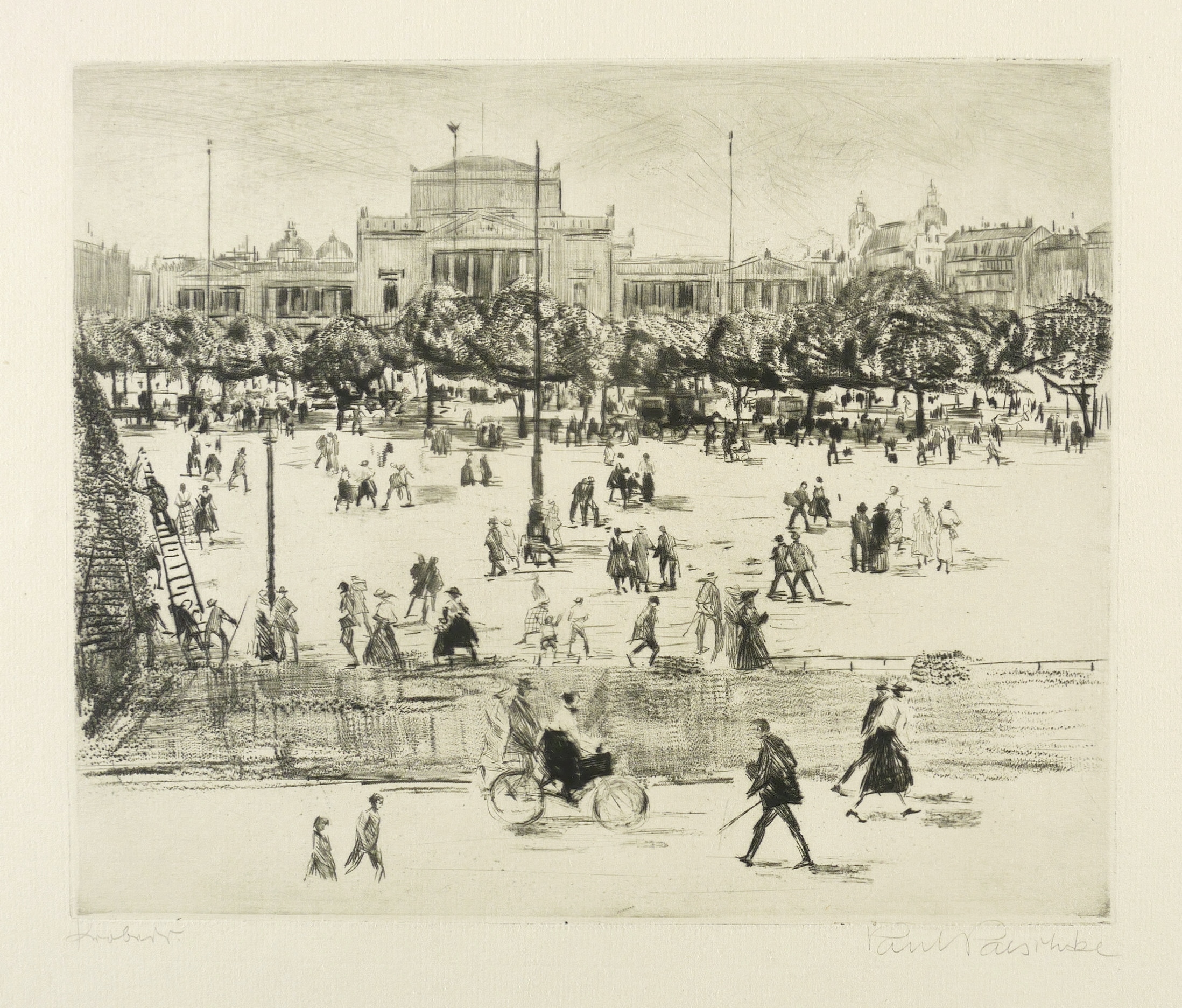 Paul Paeschke (1875 Berlin - 1943 Berlin). Deutscher Maler und Radierkünstler. 1900-06 Studium an der Kunstakademie in Berlin. Meisterschüler von Karl Köpping. Zu seinen Hauptmotiven zählten die belebten, innerstädtischen Straßen und Plätze Berlins und anderer europäischer Städte, die er gern lichtdurchflutet in einer impressionistischen Darstellungsweise wiedergab. Paeschke gilt als begnadeter Radierkünstler, der die diversen Techniken des Tiefdrucks von der Kaltnadel bis zum Roulette nahezu bis zur Perfektion trieb.