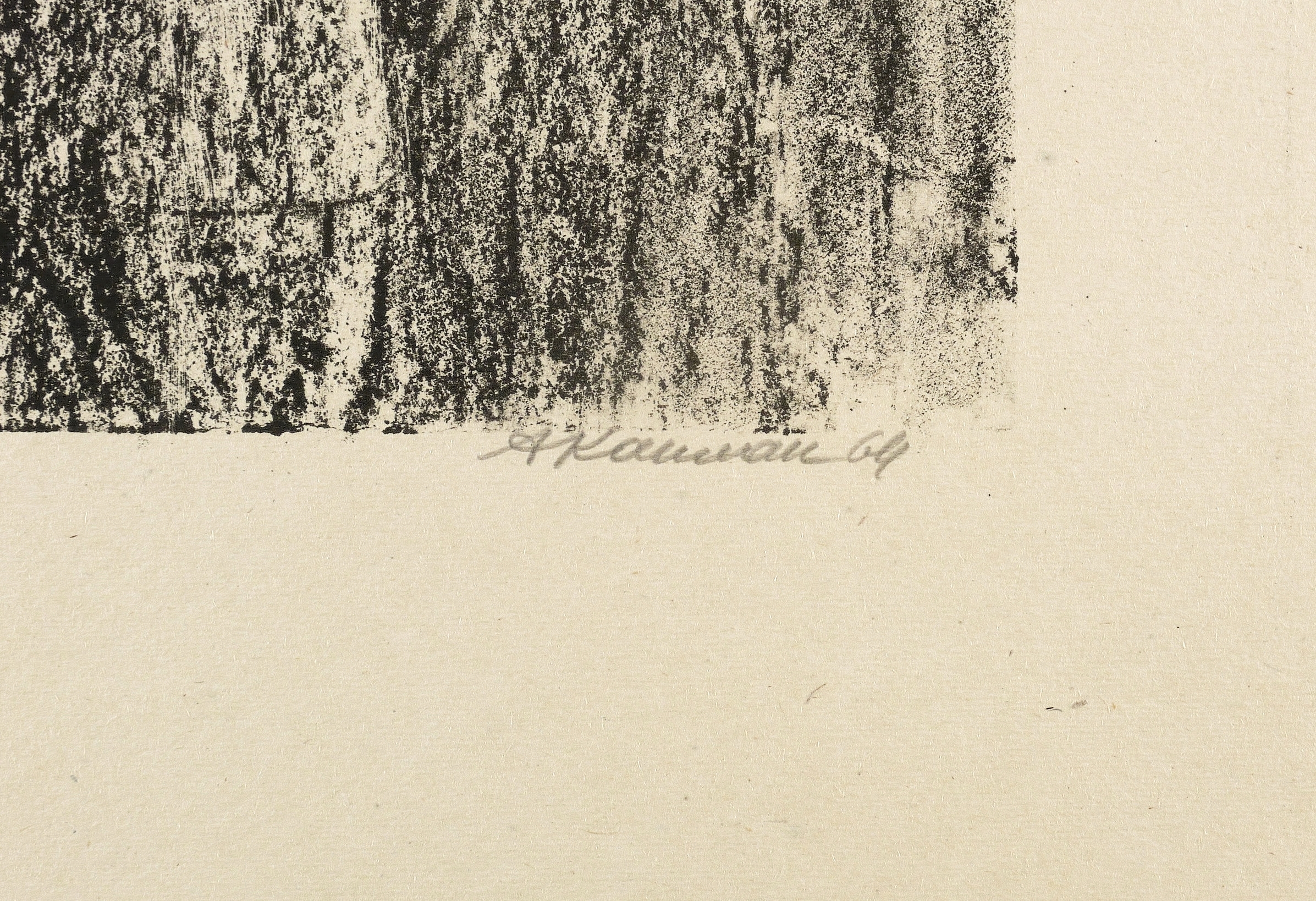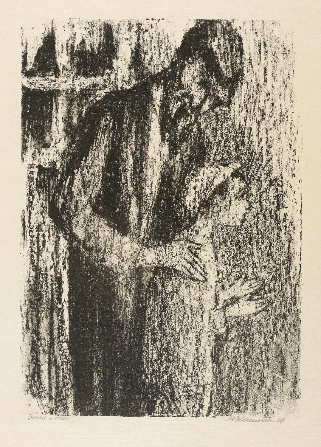 1964. Lithografie / Kreide- & Pinsellithografie, partiell geschabt, in Schwarz, auf grobem gelbem Velin. – Originale Künstlergrafik, von Anatoli Kaplan. – 40,8 x 29,0 cm (Darstellung / Druckbild), 63 x 48 cm (Blatt).