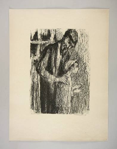 Rechts unten in Bleistift signiert und datiert: ″АКаплан 64″. Links kyrillisch Titel: ″Отец и сын″. – Abzug außerhalb der Auflage von 125 Exemplaren zum lithografischen Mappenwerk ″Tewje, der Milchmann″ zu Scholem Alejchem (Moskau: Sovetskij Chudoznik 1961/1966). Druck wohl in Leningrad. – Die etwas spätere Edition als illustriertes Buch (Dresden: Verlag der Kunst 1967) wurde als ″Schönstes Buch der DDR 1967″ ausgezeichnet. – Sehr selten. – Provenienz: Sammlung Erhard Frommhold, Dresden. Frommhold war Cheflektor vom Verlag der Kunst Dresden. – Untadeliges Exemplar. Sehr guter Zustand.