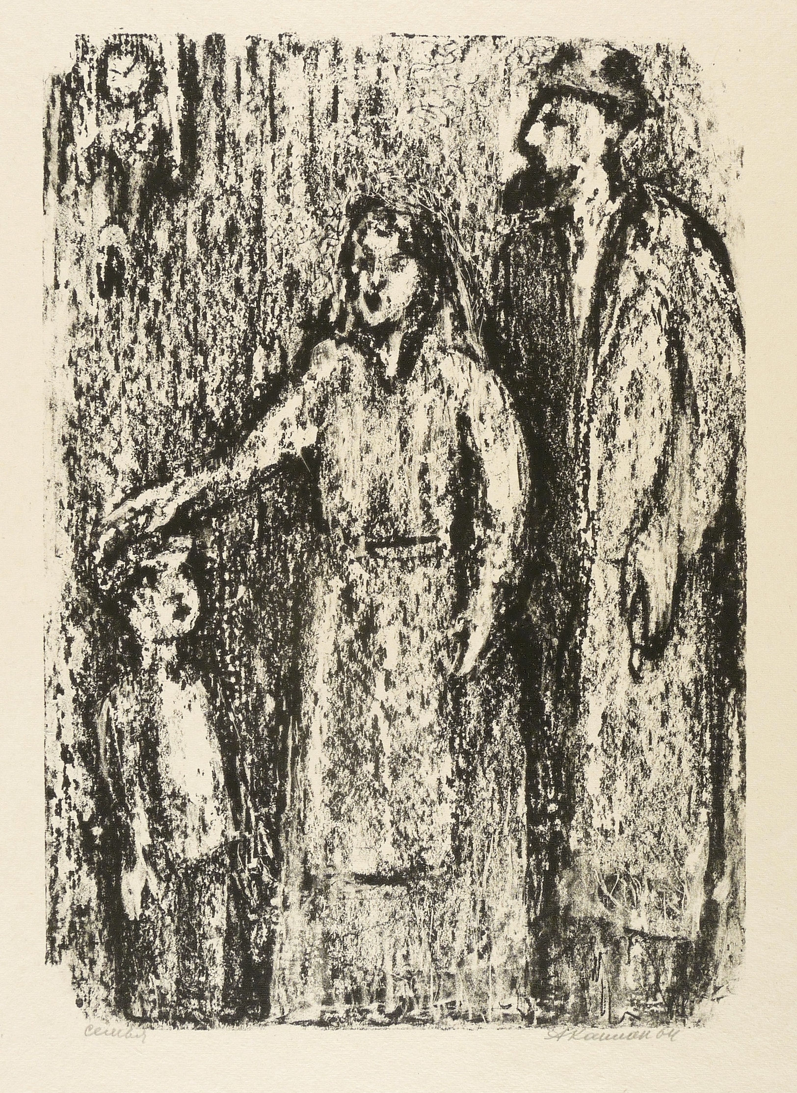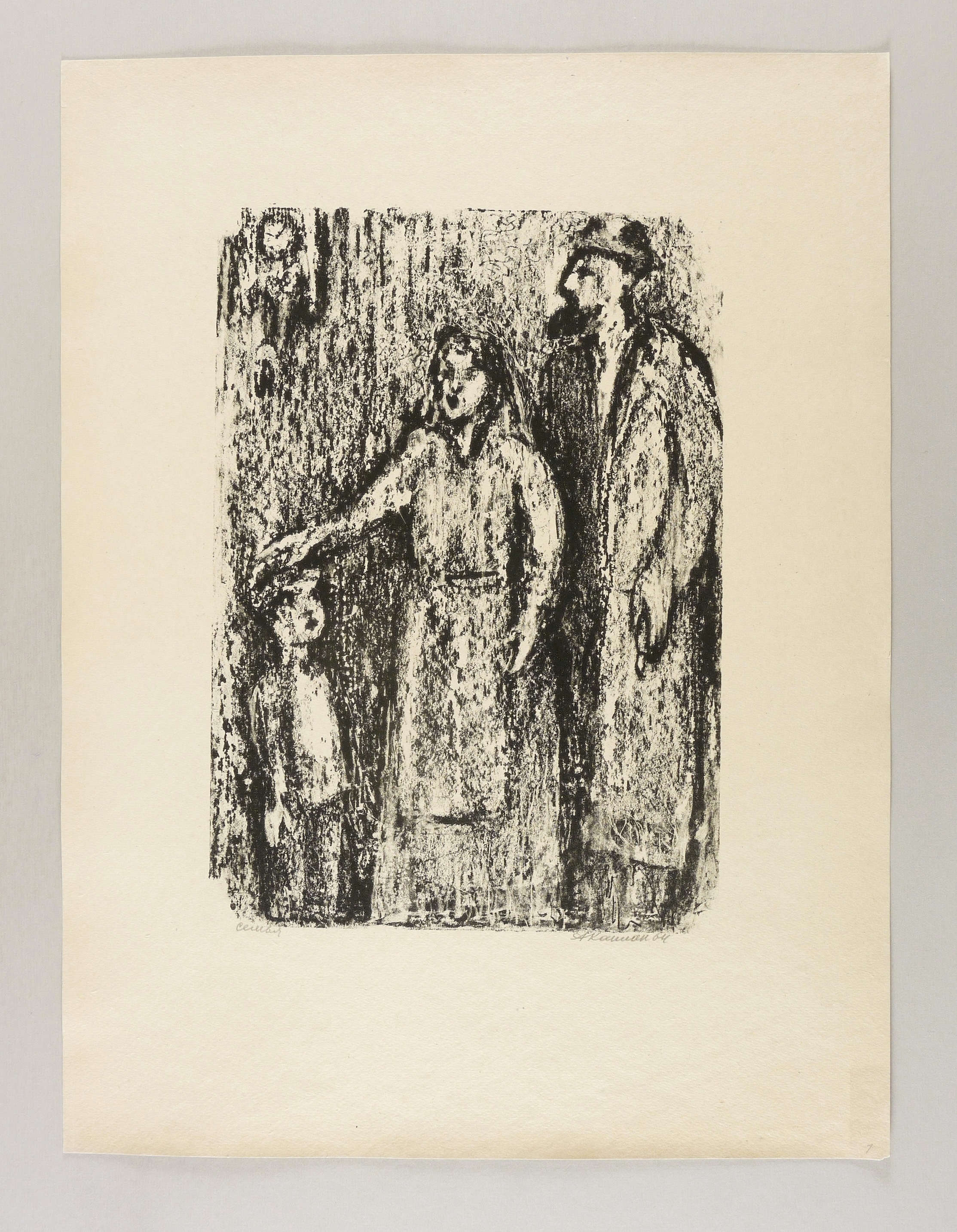 Mayer-Strodt 66. – Rechts unten in Bleistift signiert und datiert: ″АКаплан 64″. Links kyrillisch Titel: ″Семья″. – Abzug außerhalb der Auflage von 125 Exemplaren zum lithografischen Mappenwerk ″Tewje, der Milchmann″ zu Scholem Alejchem (Moskau: Sovetskij Chudoznik 1961/1966). Druck wohl in Leningrad. – Die etwas spätere Edition als illustriertes Buch (Dresden: Verlag der Kunst 1967) wurde als ″Schönstes Buch der DDR 1967″ ausgezeichnet. – Sehr selten. – Provenienz: Sammlung Erhard Frommhold, Dresden. Frommhold war Cheflektor vom Verlag der Kunst Dresden. – Schönes Exemplar. Sehr guter Zustand.