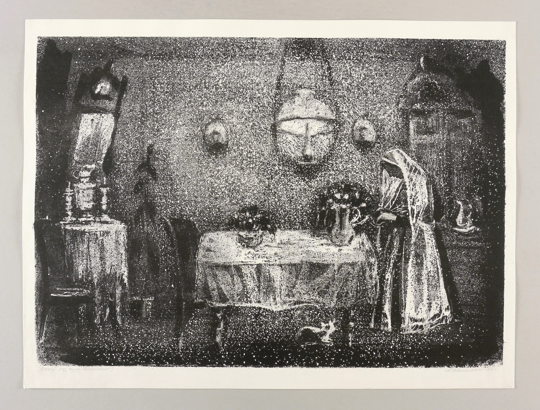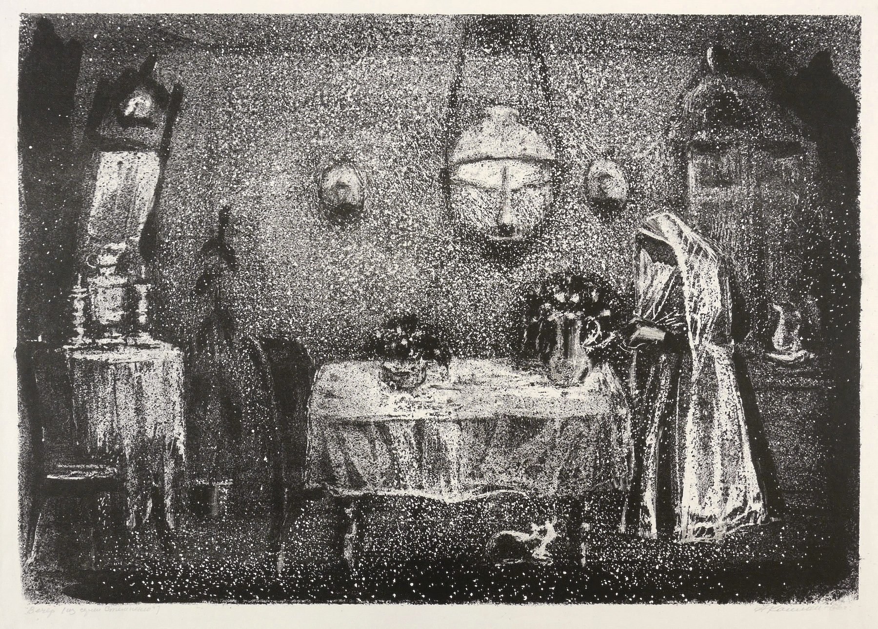 Mayer-Strodt IX 9. – Rechts unten in Bleistift kyrillisch signiert und datiert: ″АКаплан 66″. Links kyrillisch betitelt. – Blatt Nr. 9 aus der Folge ″Stempenju″ zum gleichnamigen Roman von Scholem Alejchem. – Provenienz: Sammlung Erhard Frommhold, Dresden. Frommhold war Cheflektor vom Verlag der Kunst Dresden. – Tadellos. Sehr guter Zustand.