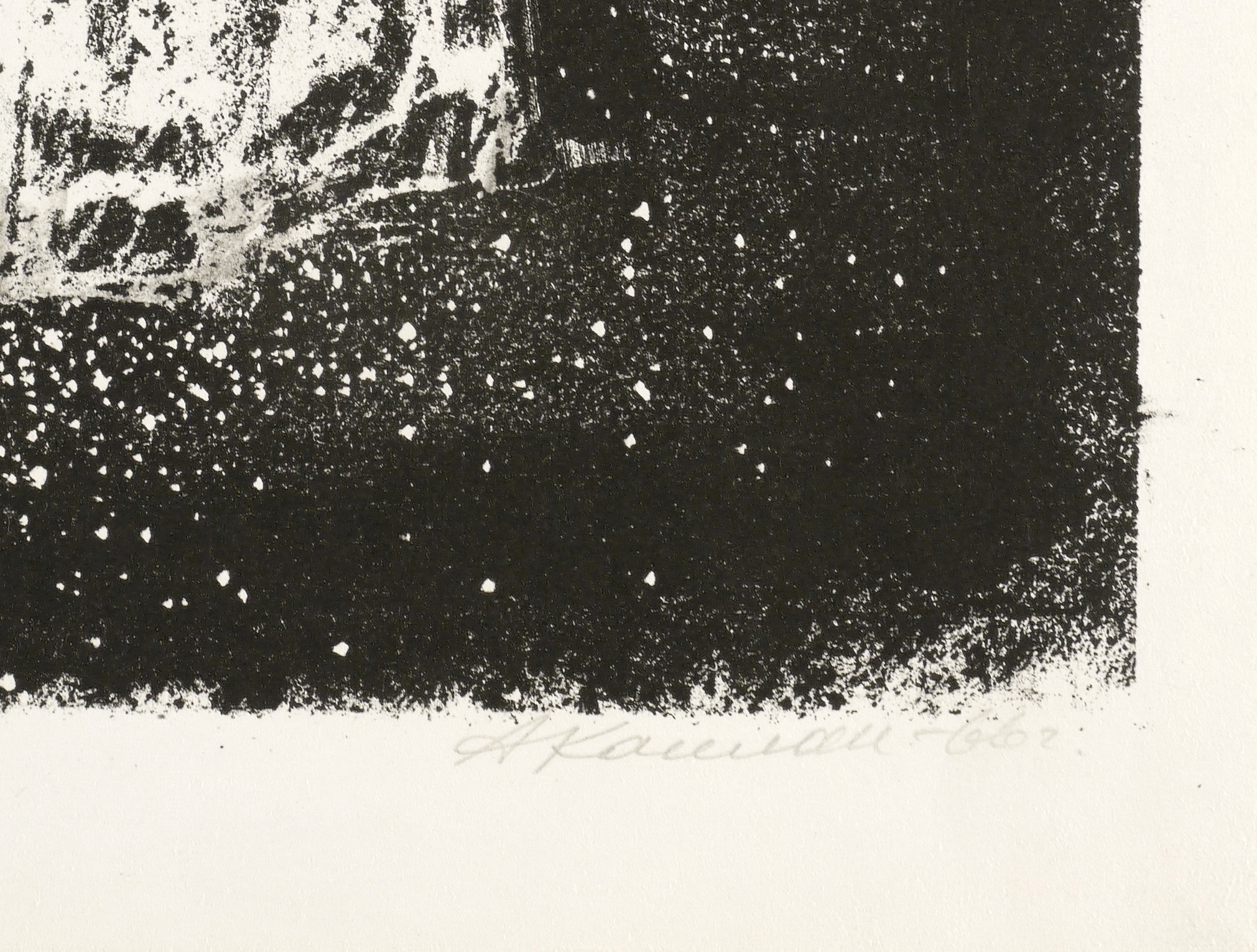 1966. Lithografie / Pinsel- & Kreidelithografie, partiell gespritzt & geschabt, in Schwarz, auf gelbem Velin. – Originale Künstlergrafik, von Anatoli Kaplan. – 42,1 x 59,7 cm (Darstellung / Druckbild), 48 x 63 cm (Blatt).