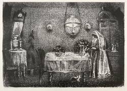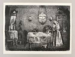 Anatoli Kaplan (1902 Rahatschou, Weißrussland - 1980 Leningrad). Russisch-jüdischer Maler, Bildhauer und Grafiker. Arbeitete zunächst in seiner Heimatstadt als Zeichenlehrer. 1922-27 Studium an der Kunstakademie in Petrograd (später Leningrad). Nach dem Studium freiberuflich tätig. Ab 1934 Studium der Lithografie in der Experimentierwerkstatt des Leningrader Künstlerverbandes bei Georgi Werejski, ehemals Kustos am Kupferstichkabinett der Eremitage. 1937-40 erste lithografische Folge "Kasrilowka" mit jüdisch-folkloristischen Impressionen aus Rogatschow / heute das belarussische Рагачоў. 1939 Aufnahme in den Verband sowjetischer Künstler. 1941 Evakuierung in den Ural nach Tschussew. Dort arbeitete er vorübergehend wieder als Zeichenlehrer. 1944 Rückkehr nach Leningrad. 1944-46 Arbeit an der Lithografie-Folge "Leningrad". 1953/54 inspiriert durch Scholem Alejchem Wiederaufnahme der "Kasrilowka"-Bilder zum heimatlichen Rogatschow als Lebensthema. So entstehen die großen Lithografie-Zyklen zur jüdischen Literatur: "Der behexte Schneider" (Teil 1 1957/58, Teil 2 1963), "Tewje der Milchmann" (Moskau: Chudoznik-Verlag Teile 1-2 1961, Teil 3 1966, Dresden: Verlag der Kunst 1967), "Das Zicklein" (1961), "Stempenju" (1967), "Baal Schem als Ehestifter" von J.L. Perez (1969), "Levins Mühle" von Johannes Bobrowski (1975). Später arbeitete er auch als Bildhauer und Kunsttöpfer.