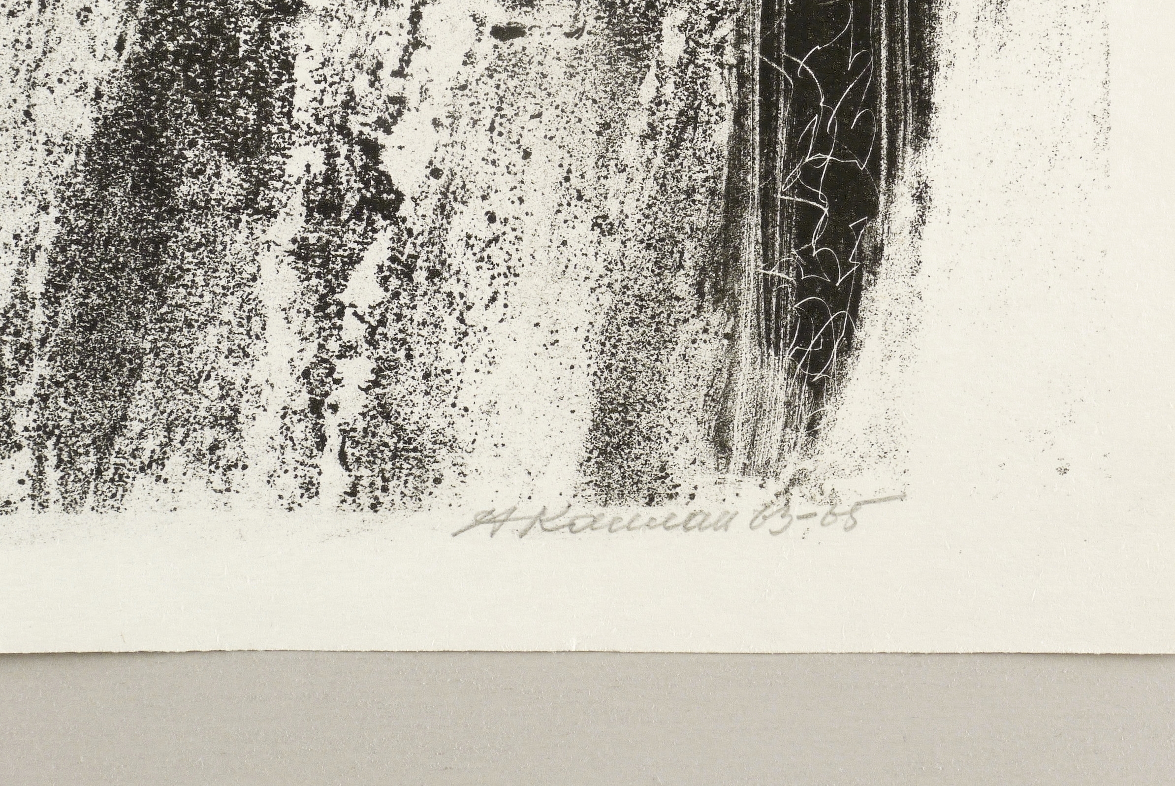 1963-1965. Lithografie / Pinsel- & Kreidelithografie, partiell gespritzt & geschabt, in Schwarz, auf gelbem Velin. – Originale Künstlergrafik, von Anatoli Kaplan. – 58,4 x 42,2 cm (Darstellung / Druckbild), 63 x 47 cm (Blatt).