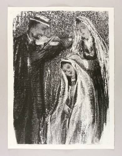 Anatoli Kaplan (1902 Rahatschou, Weißrussland - 1980 Leningrad). Russisch-jüdischer Maler, Bildhauer und Grafiker. Arbeitete zunächst in seiner Heimatstadt als Zeichenlehrer. 1922-27 Studium an der Kunstakademie in Petrograd (später Leningrad). Nach dem Studium freiberuflich tätig. Ab 1934 Studium der Lithografie in der Experimentierwerkstatt des Leningrader Künstlerverbandes bei Georgi Werejski, ehemals Kustos am Kupferstichkabinett der Eremitage. 1937-40 erste lithografische Folge "Kasrilowka" mit jüdisch-folkloristischen Impressionen aus Rogatschow / heute das belarussische Рагачоў. 1939 Aufnahme in den Verband sowjetischer Künstler. 1941 Evakuierung in den Ural nach Tschussew. Dort arbeitete er vorübergehend wieder als Zeichenlehrer. 1944 Rückkehr nach Leningrad. 1944-46 Arbeit an der Lithografie-Folge "Leningrad". 1953/54 inspiriert durch Scholem Alejchem Wiederaufnahme der "Kasrilowka"-Bilder zum heimatlichen Rogatschow als Lebensthema. So entstehen die großen Lithografie-Zyklen zur jüdischen Literatur: "Der behexte Schneider" (Teil 1 1957/58, Teil 2 1963), "Tewje der Milchmann" (Moskau: Chudoznik-Verlag Teile 1-2 1961, Teil 3 1966, Dresden: Verlag der Kunst 1967), "Das Zicklein" (1961), "Stempenju" (1967), "Baal Schem als Ehestifter" von J.L. Perez (1969), "Levins Mühle" von Johannes Bobrowski (1975). Später arbeitete er auch als Bildhauer und Kunsttöpfer.