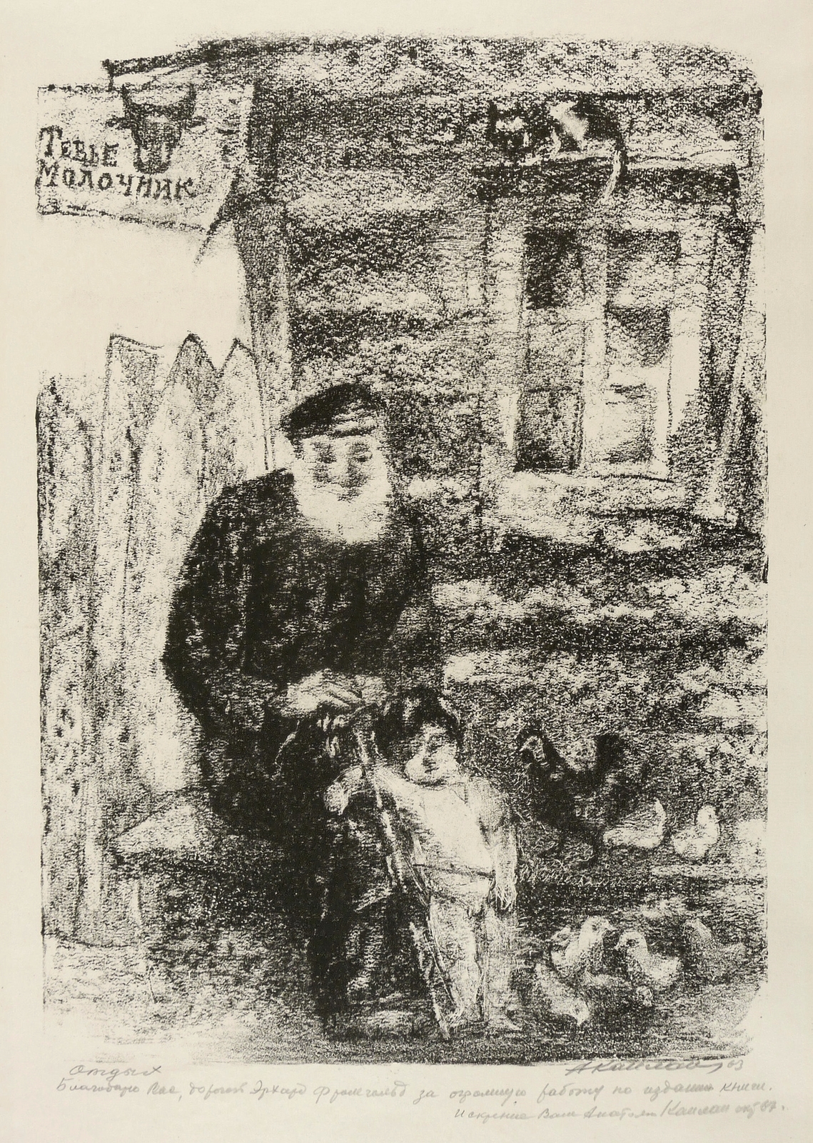 Mayer-Strodt 91. – Rechts unten in Bleistift signiert und datiert: ″АКаплан 63″. Links vom Künstler kyrillisch betitelt und mit persönlicher Widmung versehen. Im Stein links oben Türschild mit Inschrift: ″Тевье Молочник″. – Abzug als Einblattdruck außerhalb der Mappenedition und der Auflagen von 125 Exemplaren. Zum lithografischen Mappenwerk ″Tewje, der Milchmann″ zu Scholem Alejchem (Moskau: Sovetskij Chudoznik 1961/1966). Druck wohl in Leningrad. – Die etwas spätere Edition als illustriertes Buch (Dresden: Verlag der Kunst 1967) wurde als ″Schönstes Buch der DDR 1967″ ausgezeichnet. – Sehr selten. – Provenienz: Sammlung Erhard Frommhold, Dresden. Frommhold war Cheflektor vom Verlag der Kunst Dresden. – Schönes breitrandiges Exemplar. Sehr guter Zustand.