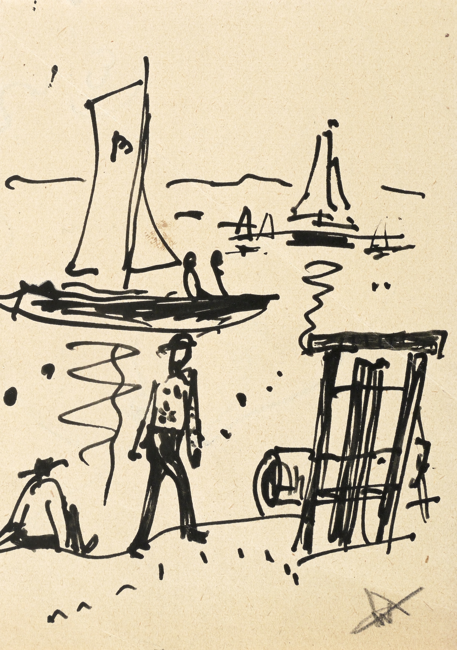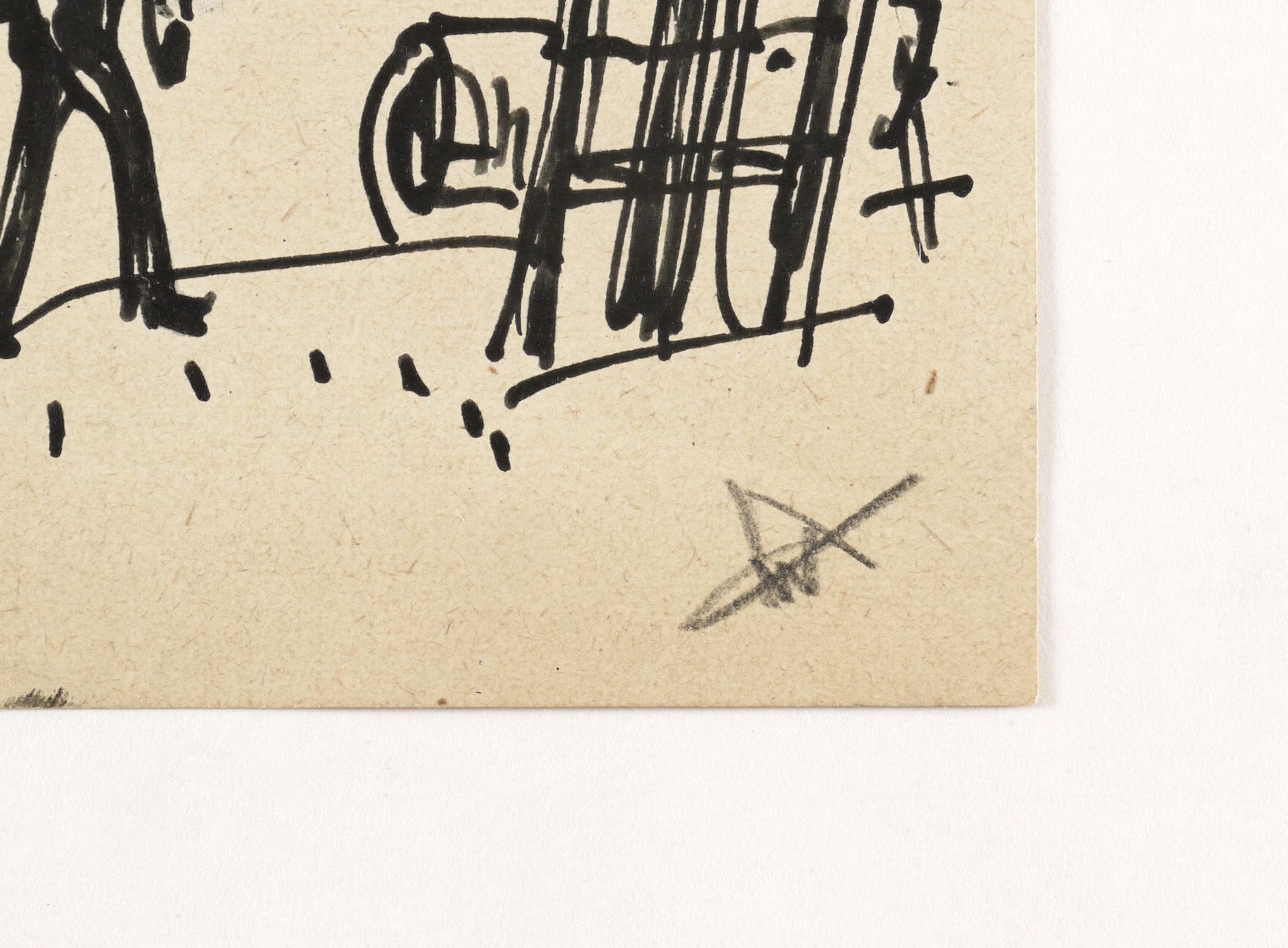 1935-1945. Zeichnung / Pinselzeichnung, in schwarzer Tusche, auf gelbem Maschinenpapier. – Originale Künstlergrafik, von Alexander Wolfgang. – Unikat. – 15,1 x 10,8 cm (Darstellung / Blatt).