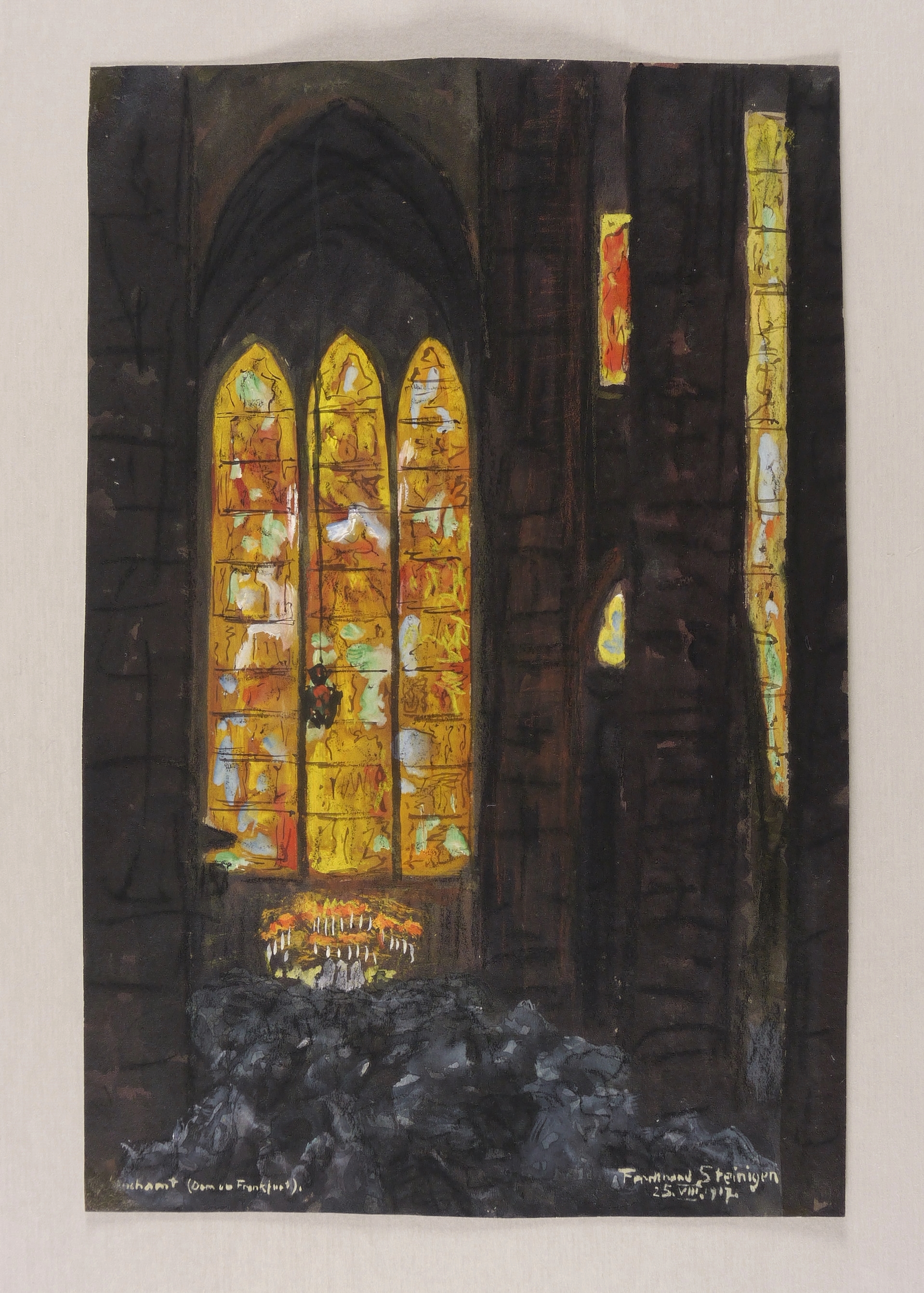 Rechts unten in Deckweiß signiert und datiert: ″Ferdinand Steiniger. 25. VIII. 1917.″ Rechts Titel: ″Hochamt (Dom zu Frankfurt).″ – Sehr guter Zustand.