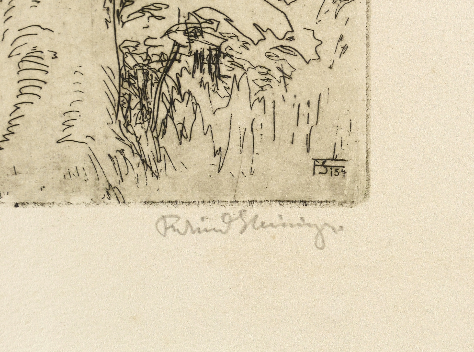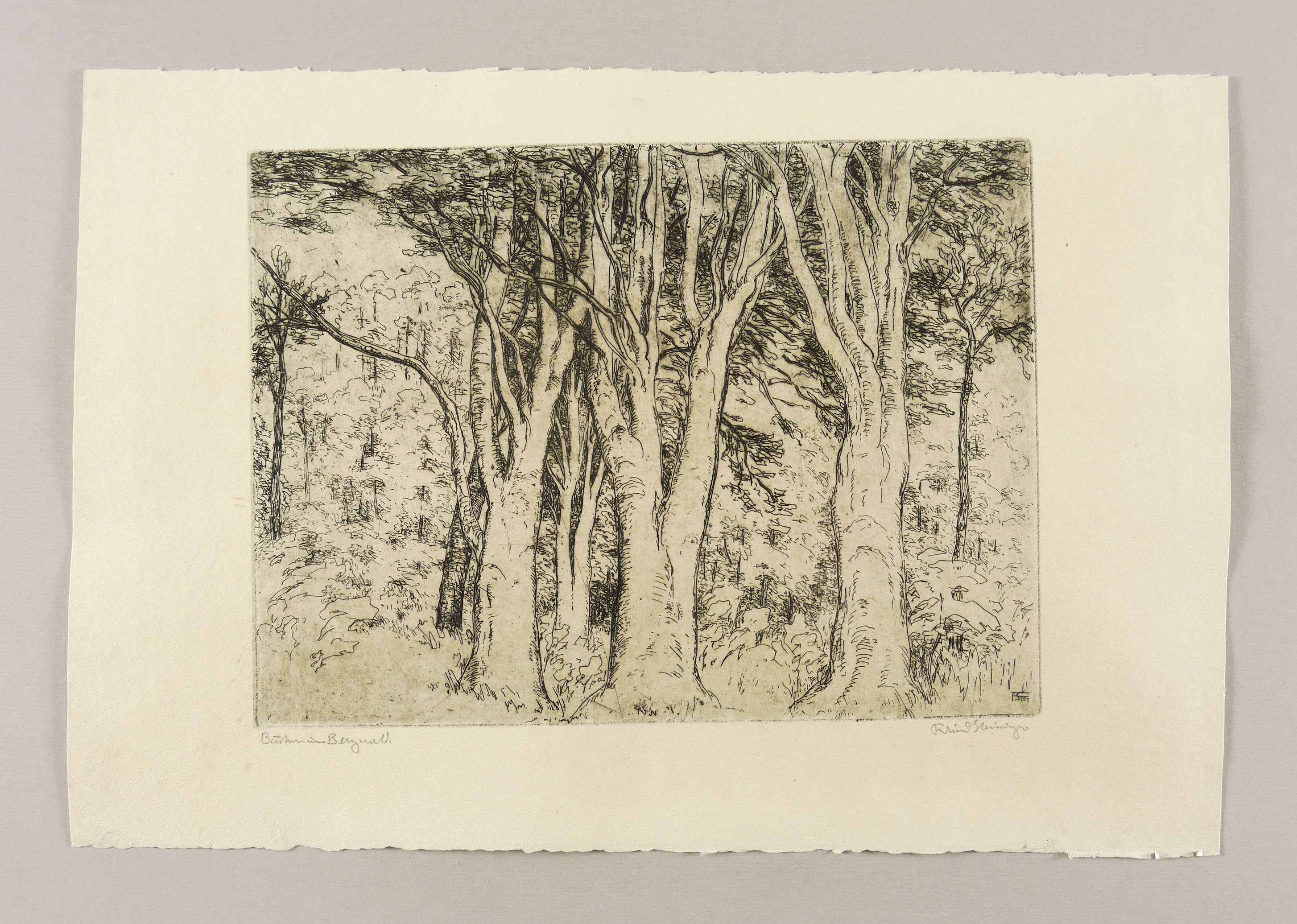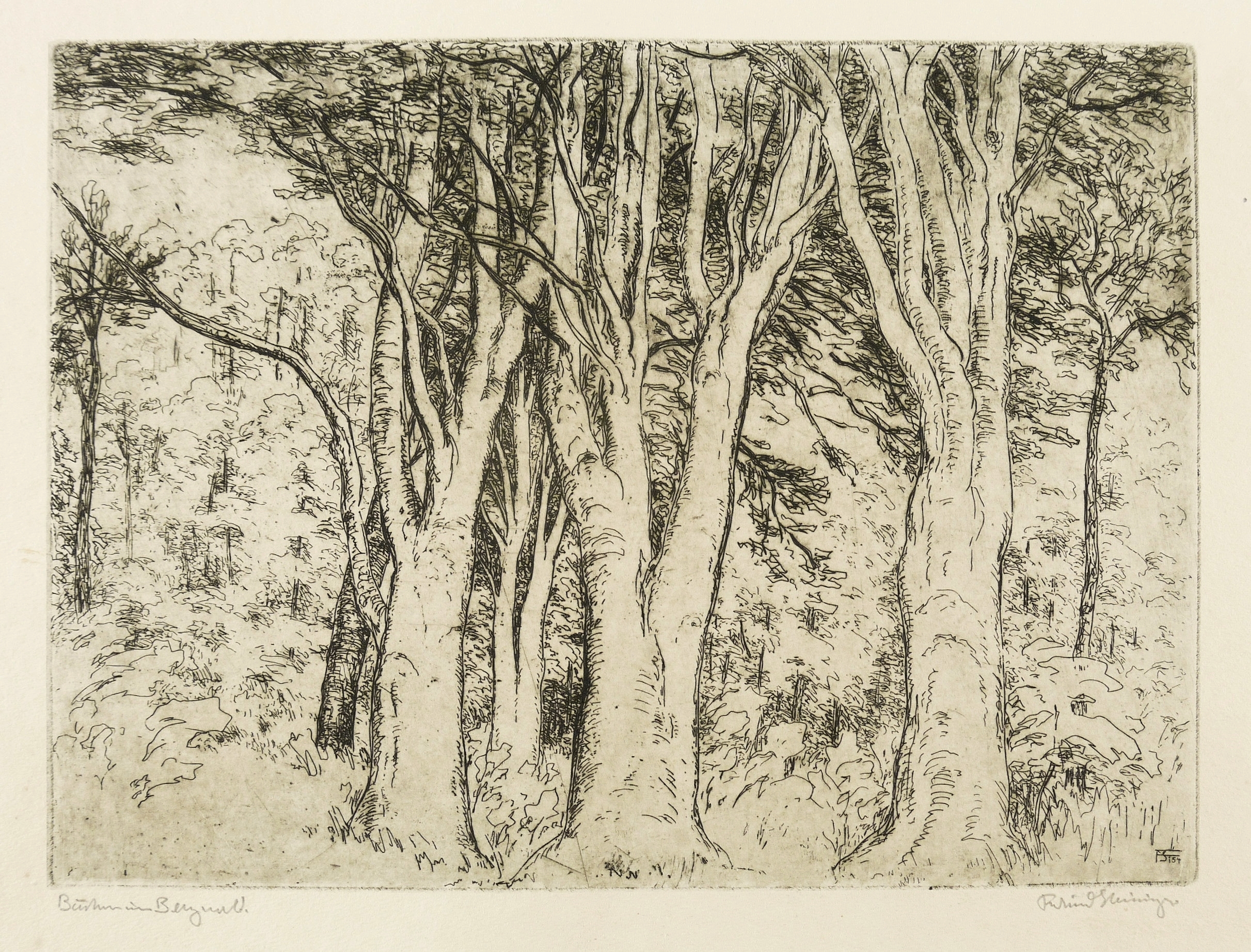 Rechts unten in Bleistift signiert: ″Ferdinand Steiniger″. Links Titel: ″Buchen im Bergwald″. In der Platte rechts unten Monogramm und Jahr: ″FSt 54″. – Schönes breitrandiges Exemplar. Sehr guter Zustand.
