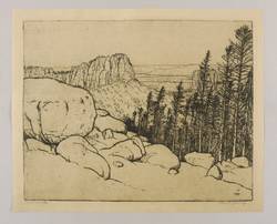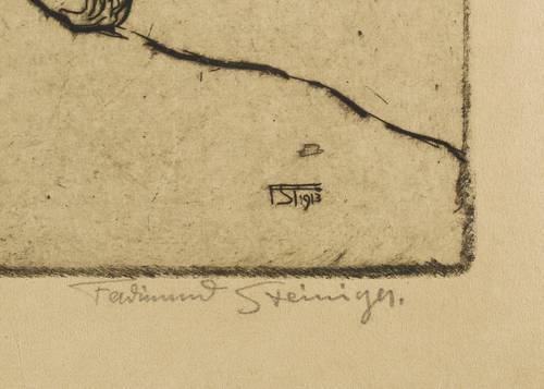 Rechts unten in Bleistift signiert: ″Ferdinand Steiniger.″ Links Titel: ″Auf stürmischer Höhe.″ In der Platte rechts unten Monogramm und Jahr: ″FST 1913″. – Sehr guter Zustand.