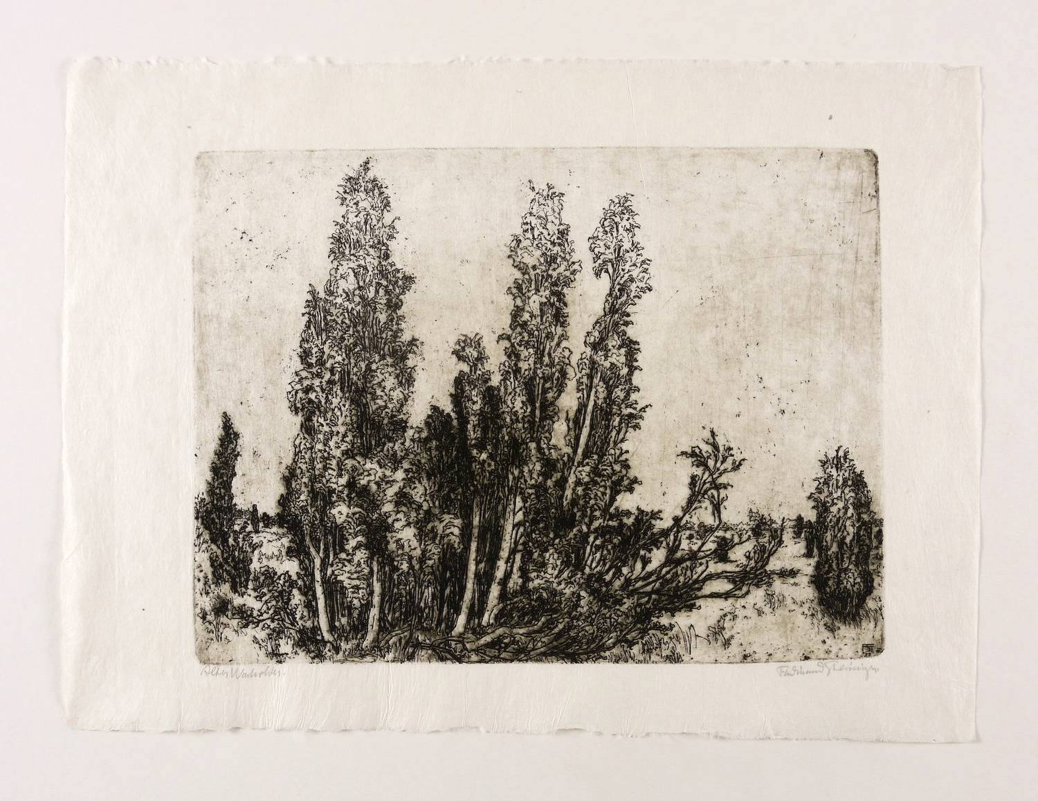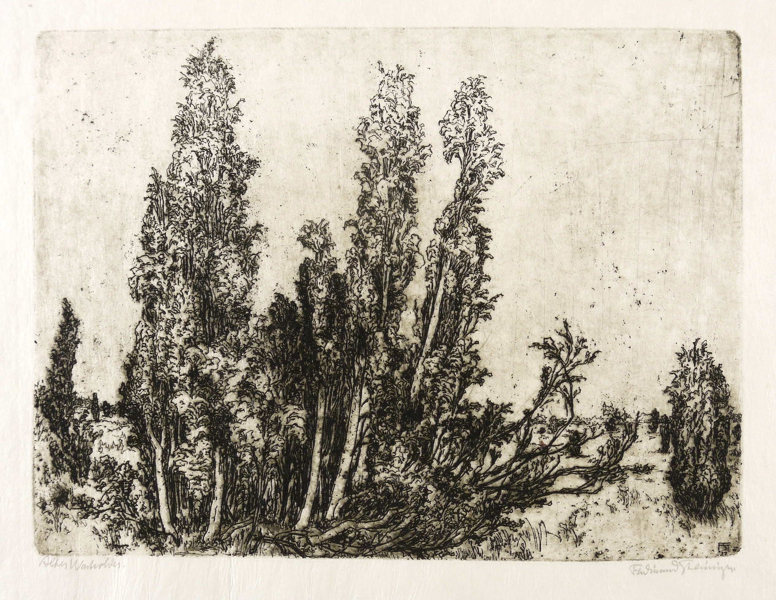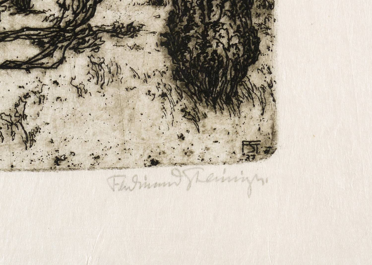 Rechts unten in Bleistift signiert: ″Ferdinand Steiniger.″ Links Titel: ″Alter Wacholder.″ In der Platte rechts unten Monogramm und Jahr: ″FST 37″. – Sehr guter Zustand.
