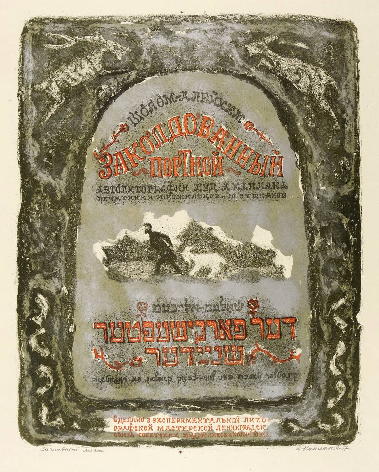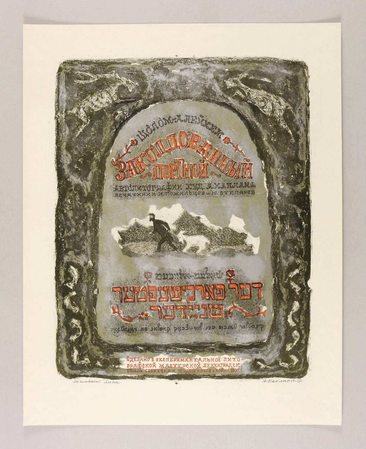 Mayer-Strodt IV 2 b. – Rechts unten in Bleistift signiert und datiert: ″АКаплан 54-57″. Links Titel: ″Заглавный лист″. Darunter weitere jiddische Inschrift sowie russischer Druckverweis. – Variante des Titelblatts aus der Folge ″Der behexte Schneider″ von Scholem Alejchem. – Provenienz: Sammlung Erhard Frommhold, Dresden. Frommhold war Cheflektor und Verlagsleiter des Verlag der Kunst Dresden, der viel mit dem Künstler zusammenarbeitete. – Blattecke links unten etwas bestoßen. Insgesamt noch sehr guter Zustand.