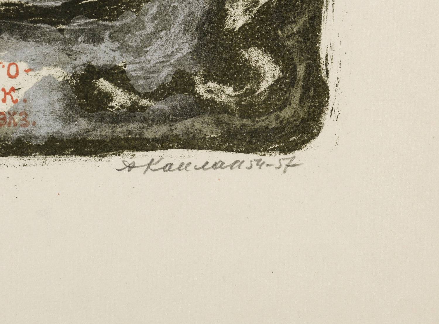1954-1957. Farblithografie / Pinsel- & Kreidelithografie, partiell geschabt, in Schwarz, Hellrot, Grün & Silber, auf gelblichem Velin. – Originale Künstlergrafik, von Anatoli Kaplan. – Auflage 600 Exemplare. – 43,5 x 35,0 cm (Darstellung / Druckbild), 55 x 43 cm (Blatt).