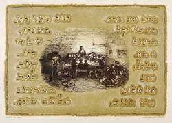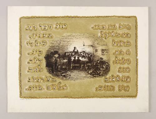 Mayer-Strodt VII 20 a. – Rechts unten in Bleistift signiert und datiert: ″АКаплан 1960″. Links Titel: ″песня 'школа'″. Seitlich weiter ausführliche jiddische Inschrift. – Kein Exemplar der Auflagendrucke. Seltene Farbvariante. Im Werkverzeichnis von Rudolf Mayer und Lia Schrodt werden nur Farbvarianten mit Schwarz, Olive und Gold sowie Schwarz, Silber und Rosa erwähnt (WVZ Nr. VII 20, S. 52). – Dargestellt ist ein Zimmer, darin ein Lehrer mit zahlreichen Kindern im Unterricht. Illustration zu dem Lied ″Cheder″ oder ″Chejderlid″, etwa: ″Ejf un pripetschek / brent a fajerl, / un in schtub is hejss. / un der rebenju / mit di kinderlach / lernen alef, bejss.″ – Provenienz: Sammlung Erhard Frommhold, Dresden. Frommhold war Cheflektor und Verlagsleiter des Verlag der Kunst Dresden, der viel mit dem Künstler zusammenarbeitete. – Papier mit leichten Altersspuren. Bisweilen schwach fingerfleckig. Insgesamt durchaus noch guter Zustand.