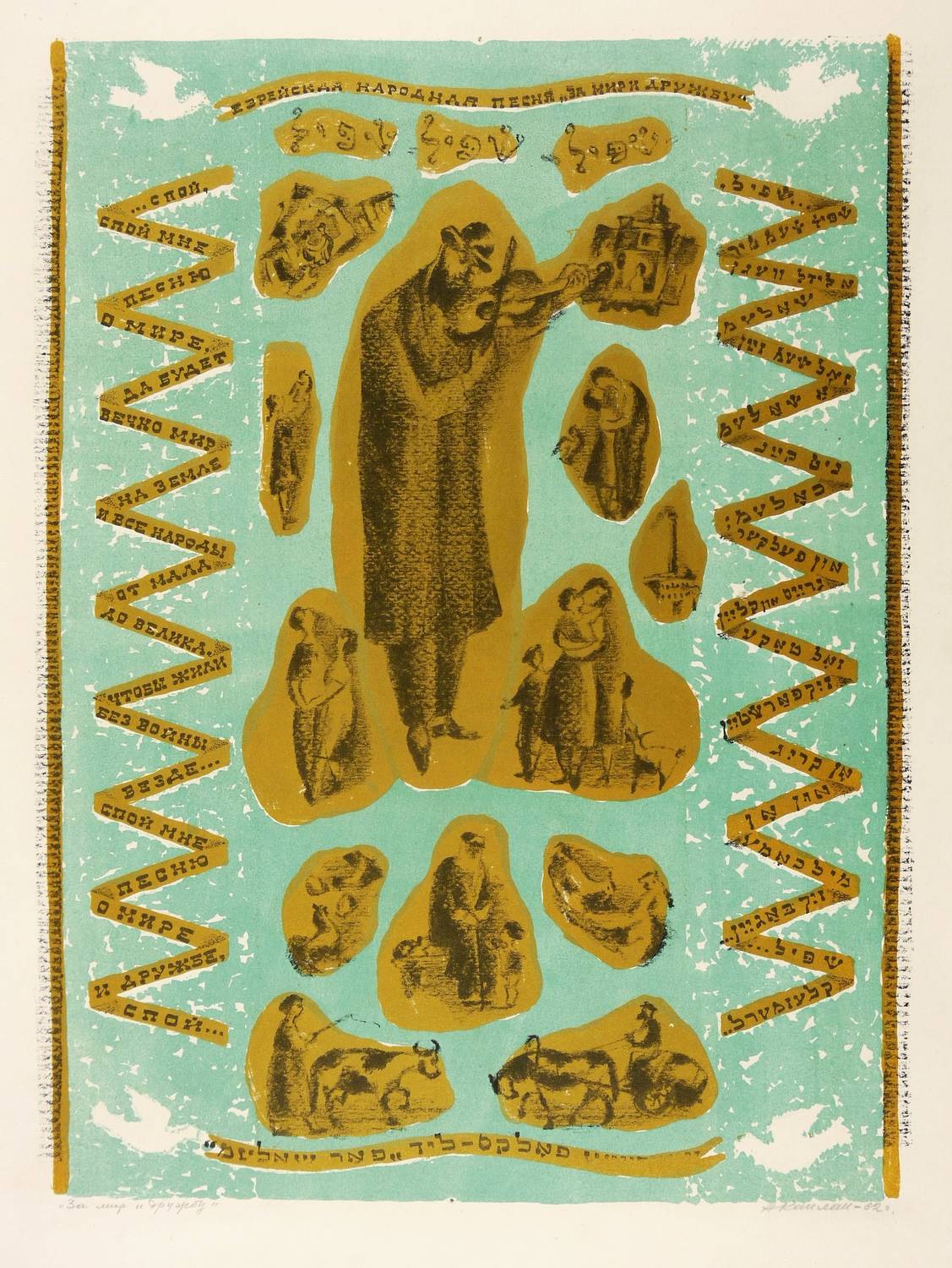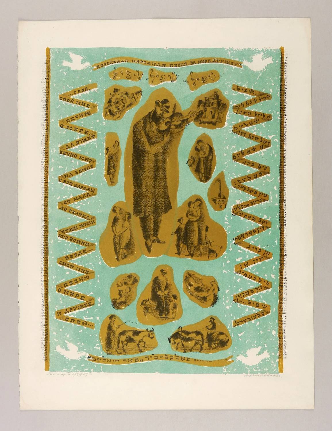 Mayer-Strodt VII 7. – Rechts unten in Bleistift signiert und datiert: ″АКаплан 1962″. Links Titel: ″За мир и дружбу″. Seitlich in den herabfallenden Bändern jiddische Inschrift. – Kein Exemplar der Auflagendrucke. Seltene Farbvariante. Im Werkverzeichnis von Rudolf Mayer und Lia Schrodt wird nur die Farbvariante mit Schwarz, Rot, Gold und Grün erwähnt (WVZ Nr. VII 7, S. 50). – Illustration zu dem jiddischen Volkslied ″Far scholem″ oder ″Für Frieden und Freundschaft″: ″Schpil, schpil, schpil! / Schpil schojn mir a lidl wegen scholem. / Sol schojn sajn a scholem, / nit kain cholem / un feker grejss und klejn, / sol take sih farschtejn. / On krig un on milchome sih bagejn. / Schpil, klesmerl.″ – Provenienz: Sammlung Erhard Frommhold, Dresden. Frommhold war Cheflektor und Verlagsleiter des Verlag der Kunst Dresden, der viel mit dem Künstler zusammenarbeitete. – Sehr guter Zustand.