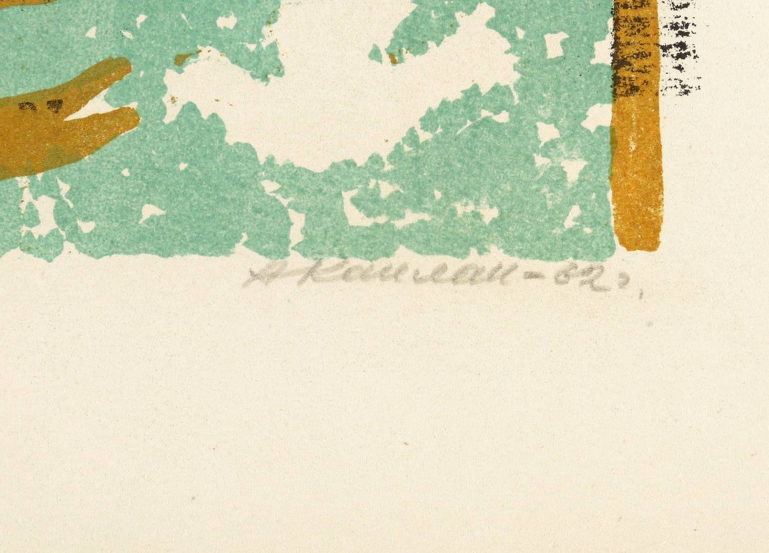 1962. Farblithografie / Kreide- & Pinsellithografie, in Schwarz, Grün & Gold, auf Velinkarton. – Originale Künstlergrafik, von Anatoli Kaplan. – 52,1 x 39,3 cm (Darstellung / Druckbild), 63 x 48 cm (Blatt).
