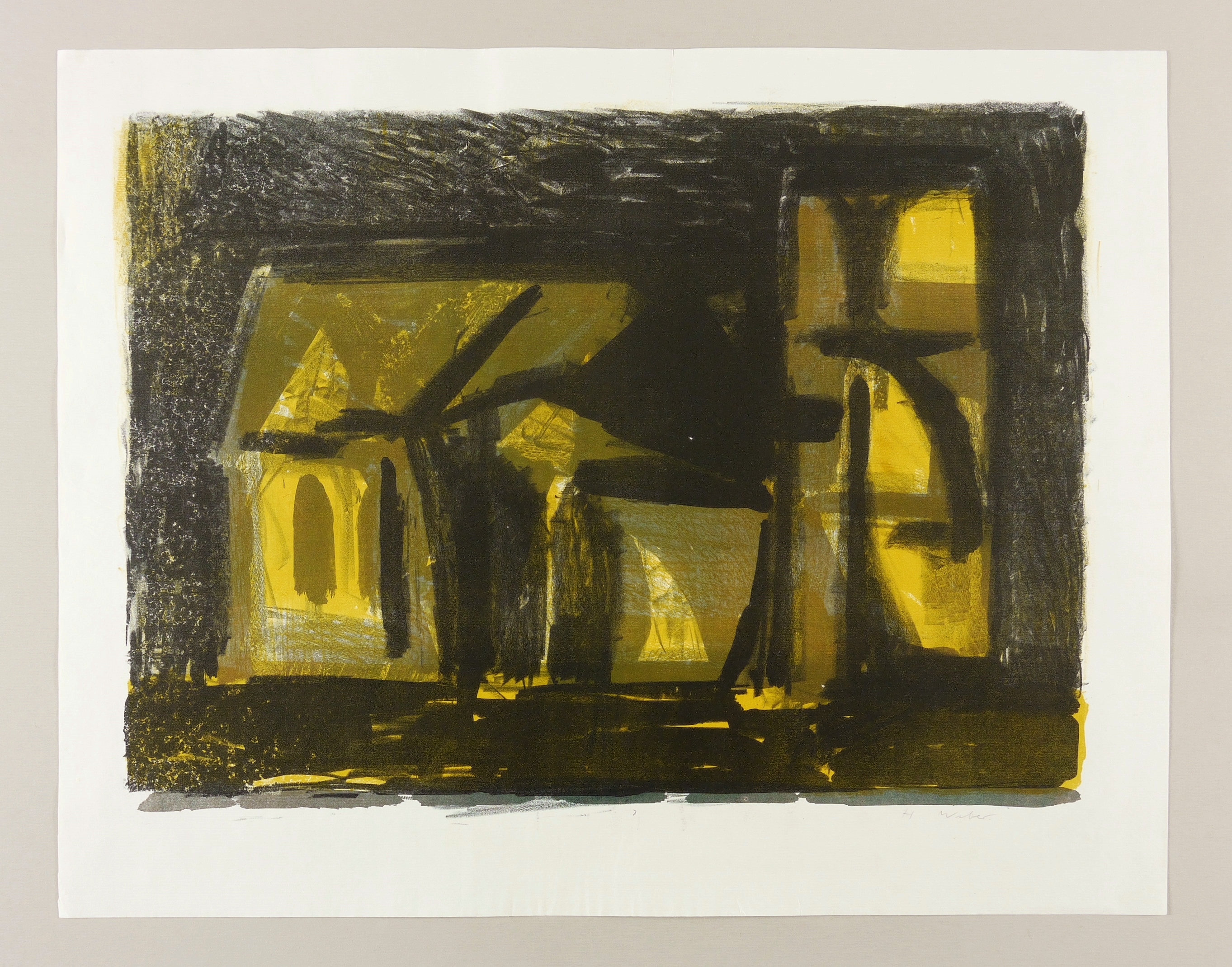 1969. Farblithografie / Kreide- & Pinsellithografie, in Olivgrün, Grau, Orange & Schwarz, auf Achat-Maschinenbütten. – Originale Künstlergrafik, von Horst Weber. – 40,0 x 55,0 cm (Darstellung / dritte), 50 x 63 cm (Blatt).