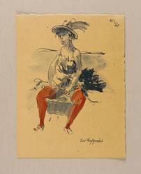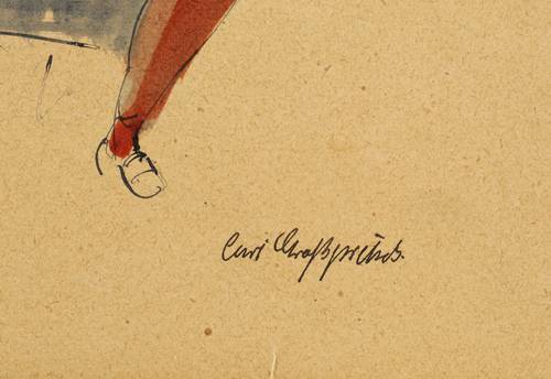 Rechts unten in schwarzer Feder signiert: ″Curt Großpietsch″. – Auf der Rückseite weitere Federzeichnung in rotbrauner Tusche mit zwei stark karikierten, teils entkleideten Männerfiguren. – Tadellos. Sehr guter Zustand.