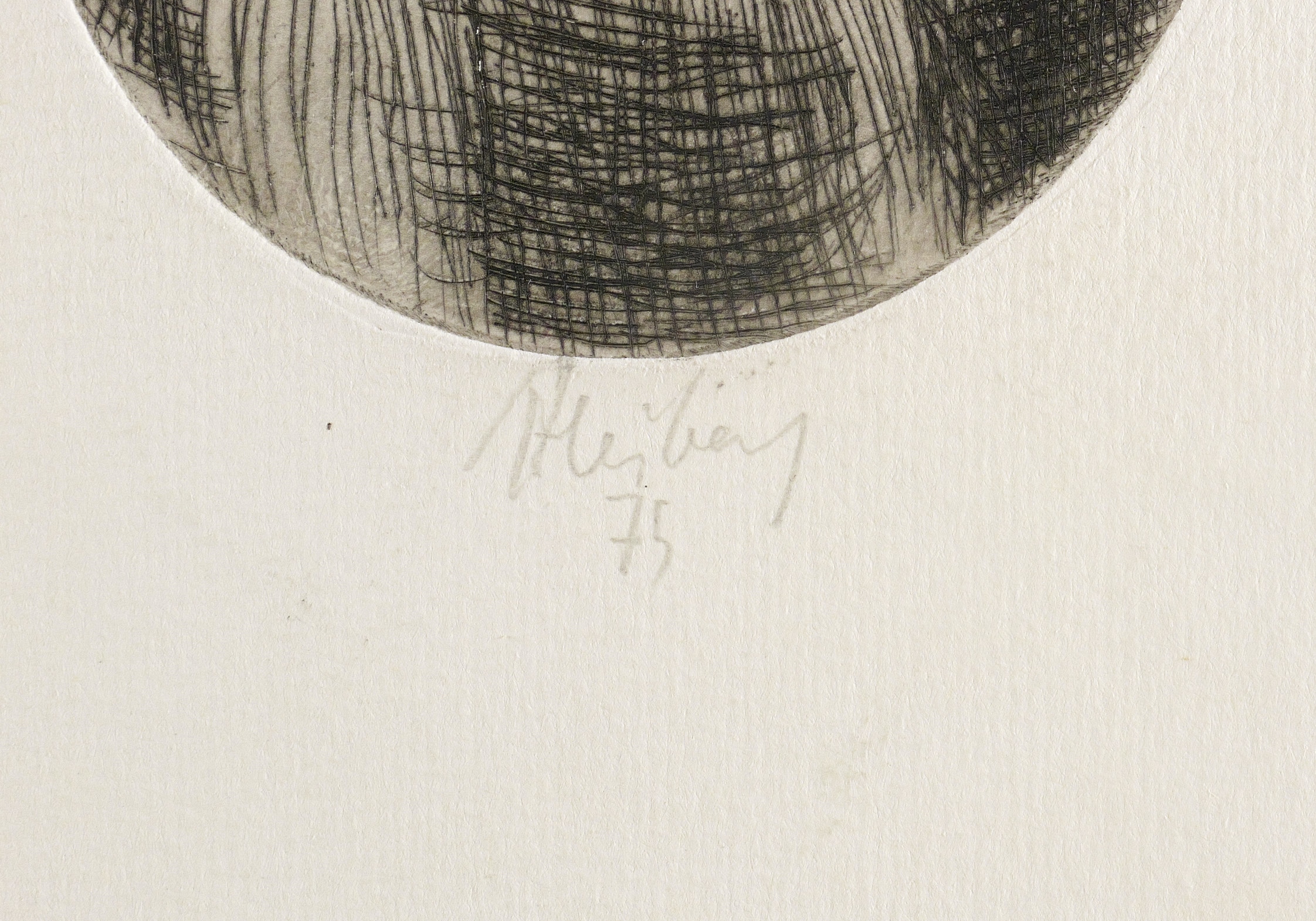 1975. Radierung / Strichätzung, in Schwarz, auf hellchamois Velin. – Originale Künstlergrafik, von Helge Leiberg. – 10,0 x cm (Darstellung / Durchmesser), 26 x 19 cm (Blatt).