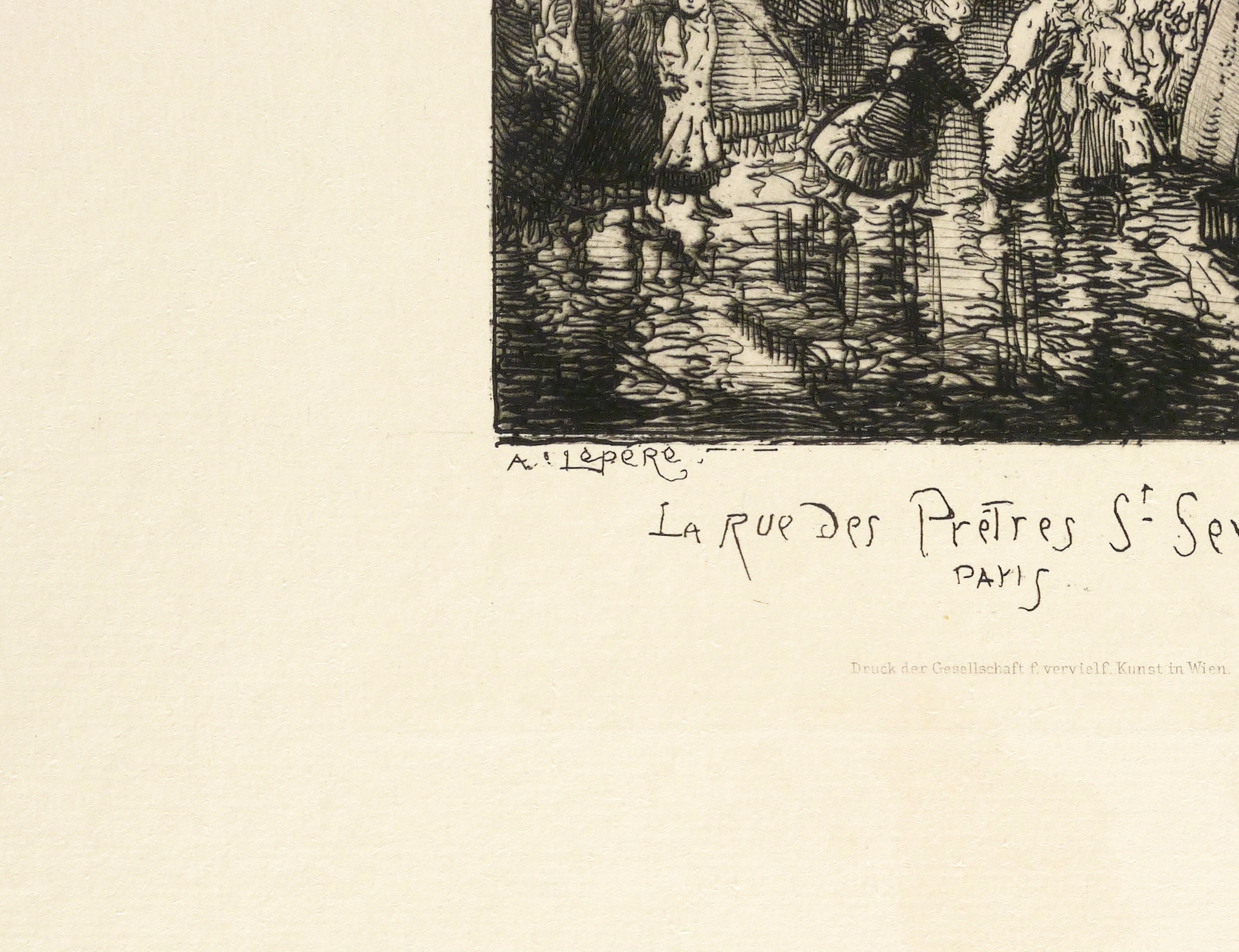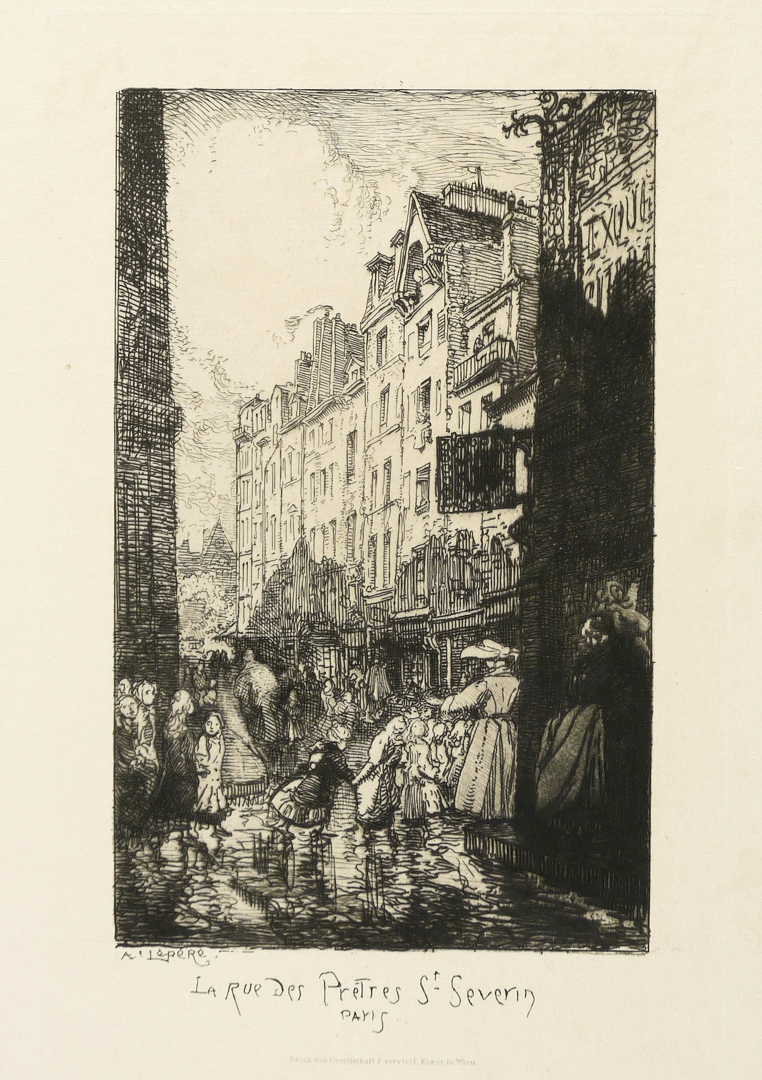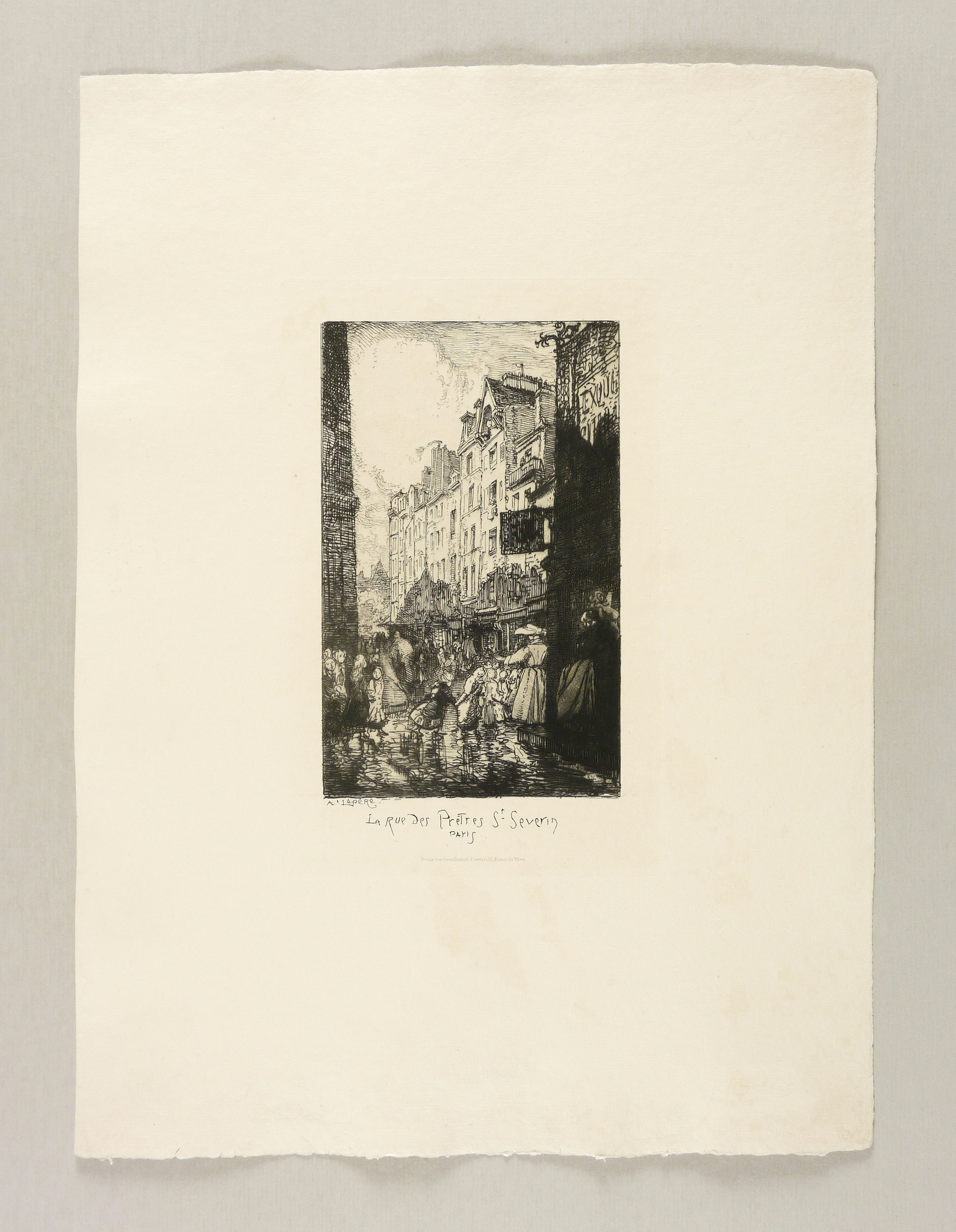 Nicht handsigniert. In der Platte links unten signiert: ″A. LepeRe″. Im unteren Plattenrand dazu Titel: ″LA Rue des Pretres St Severin PAris″. Darunter gestochene Verlagsadresse der Gesellschaft für vervielfältigende Kunst Wien. – Charakteristisches Blatt. – Originalrandiges Exemplar. Papier minimal fleckig. Guter Zustand.