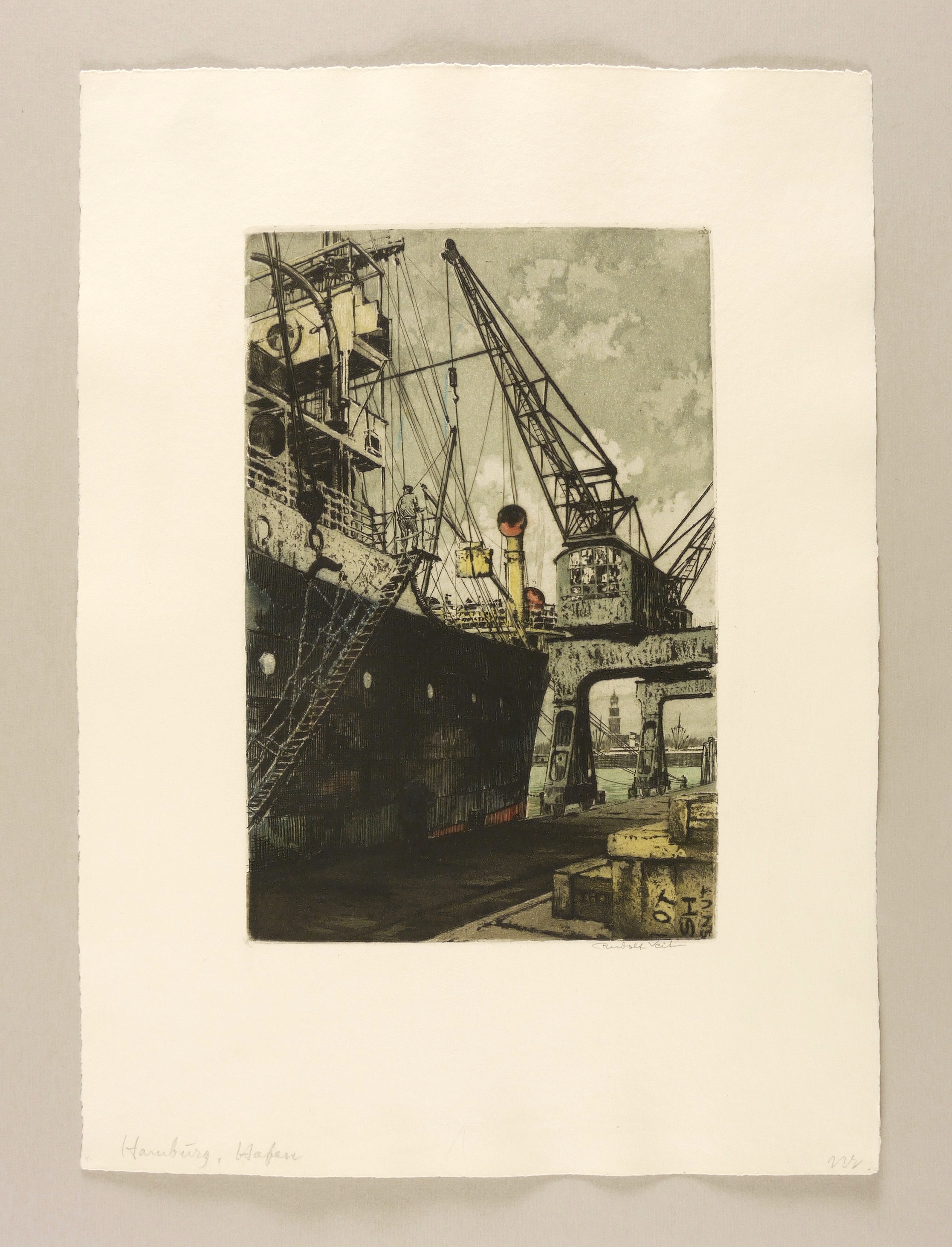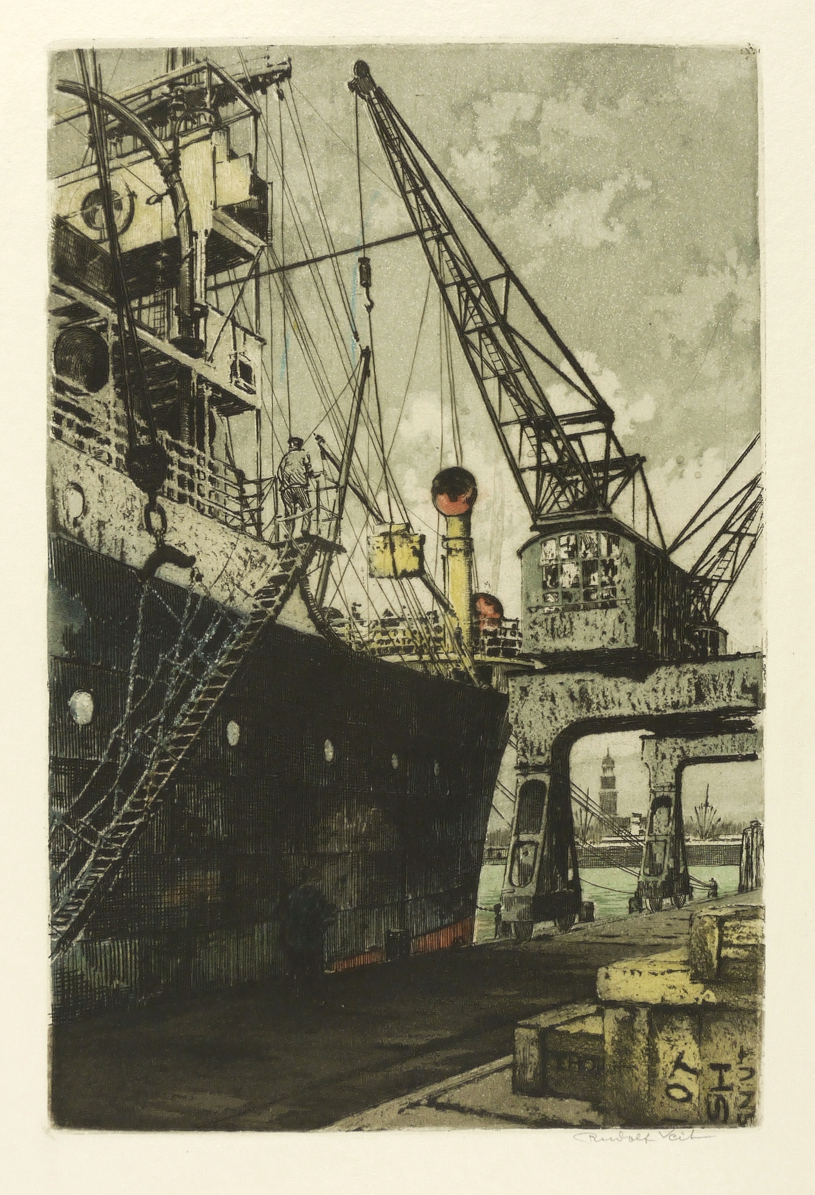 Rechts unten in Bleistift signiert: ″Rudolf Veit″. In der linken unteren Blattecke bezeichnet: ″Hamburg, Hafen″. In der Platte links unten nochmals Signatur: ″R. VEIT″. – Sehr guter Zustand.
