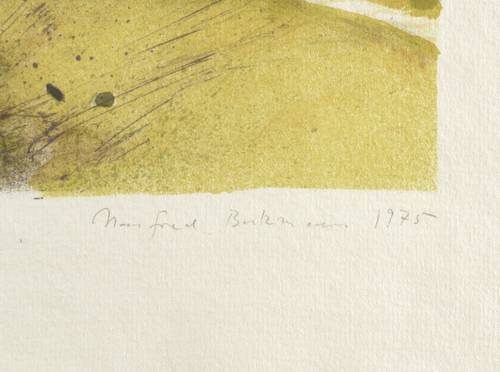 1975. Farblithografie / Pinsel- & Kreidelithografie, in 6 Farben, auf hartem hellchamois Weißenborn. – Originale Künstlergrafik, von Manfred Butzmann. – Auflage Exemplar Nr. 11/25. – 39,6 x 42,8 cm (Darstellung / Druckbild), 47 x 51 cm (Blatt).
