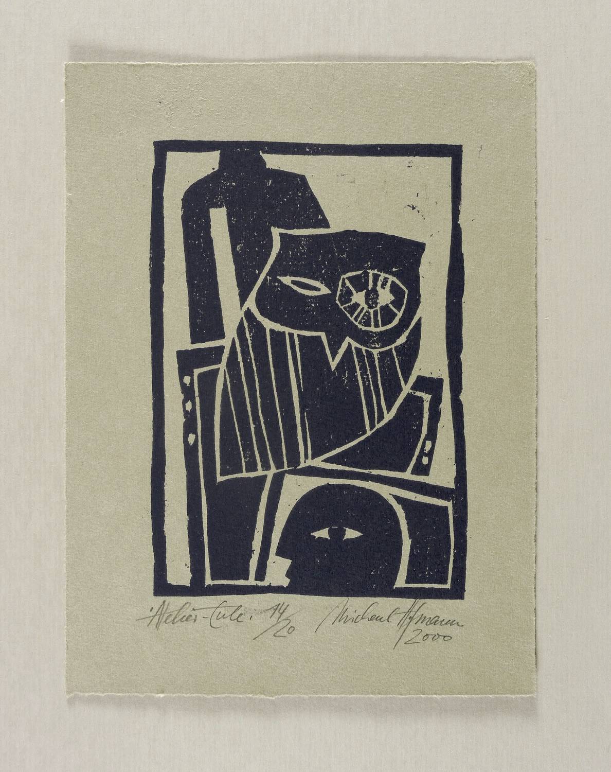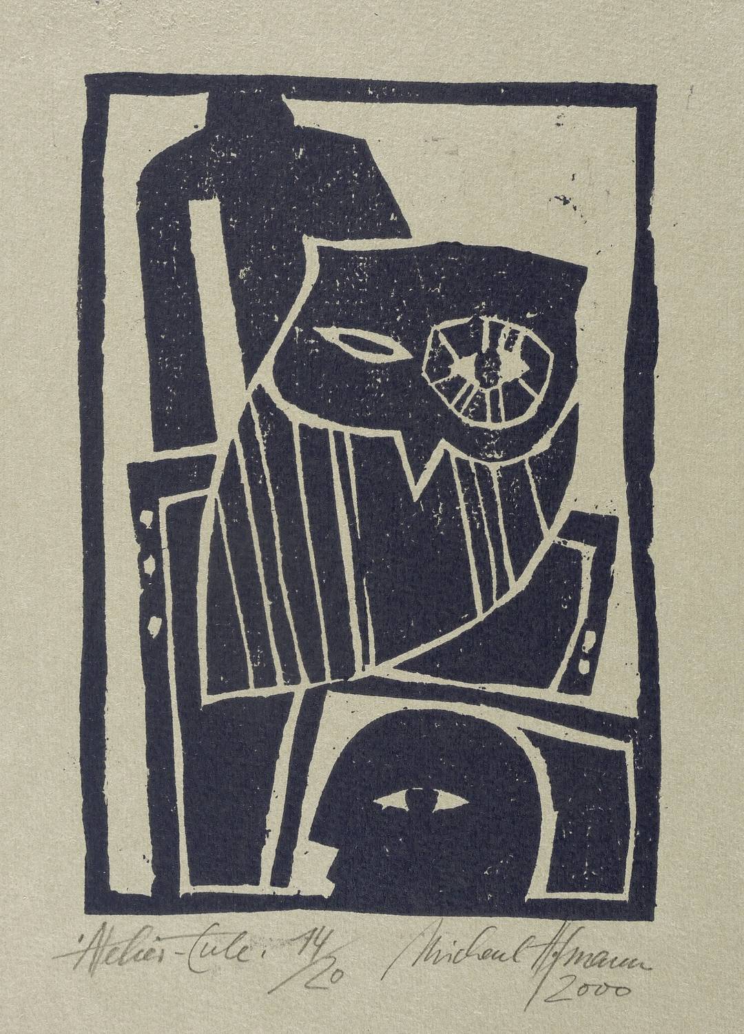 Rechts unten in Bleistift signiert und datiert: ″Michael Hofmann 2000″. Links Titel und Auflagenbezeichnung: ″Atelier-Eule / 14/20″. – Sehr guter Zustand.