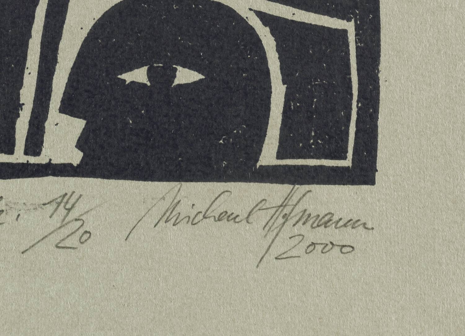 2000. Holzschnitt, in Schwarz, auf grau getöntem Hahnemühle. – Originale Künstlergrafik, von Michael Hofmann. – Auflage Exemplar Nr. 14/20. – 15,5 x 10,8 cm (Darstellung / Druckstock), 22 x 16 cm (Blatt).