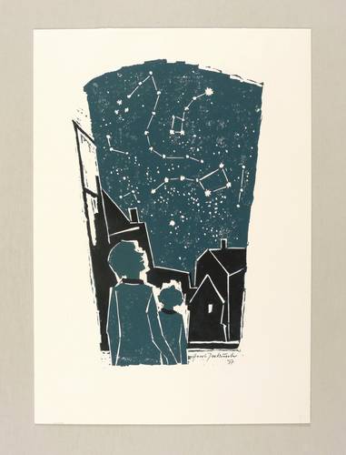 1997. Farbholzschnitt, in Dunkelblau & Schwarz, auf festem weißem Velin. – Originale Künstlergrafik, von Horst Jockusch. – 23,8 x 15,0 cm (Darstellung / Druckbild), 31 x 22 cm (Blatt).