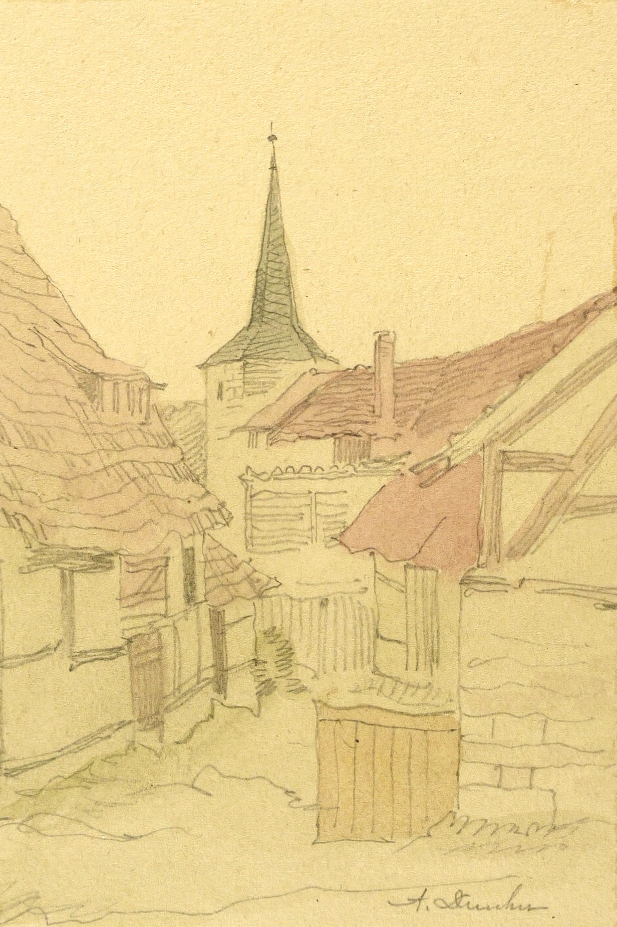 Drescher, Arno. – „Dorfansicht mit Kirchturm”.