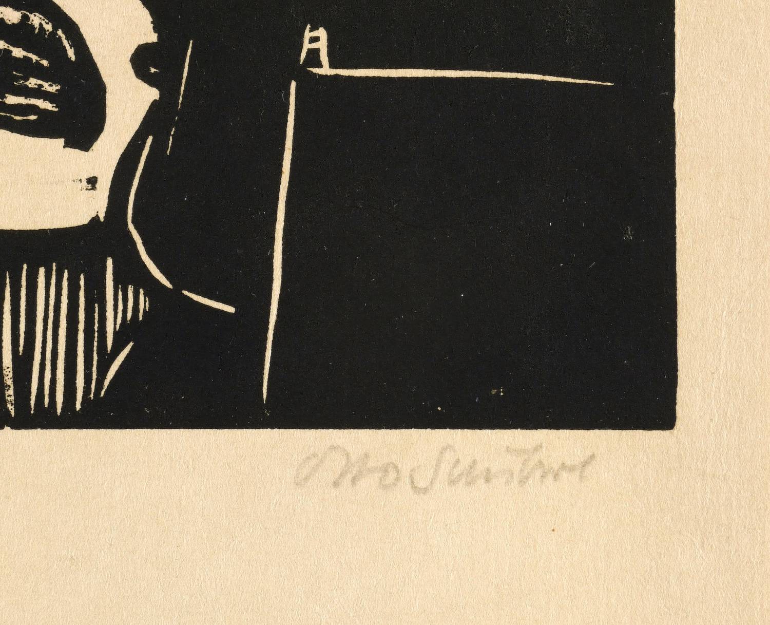 1964. Linolschnitt, in Schwarz, auf weichem gelbem Maschinenpapier. – Originale Künstlergrafik, von Otto Schubert. – 28,2 x 20,0 cm (Darstellung / Druckstock), 32 x 23 cm (Blatt).
