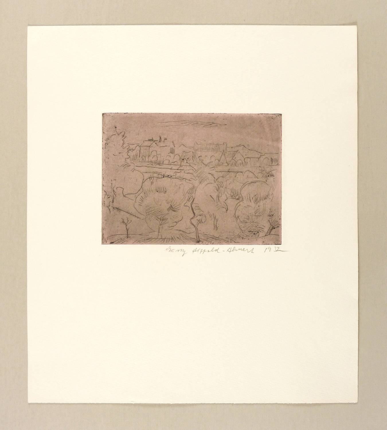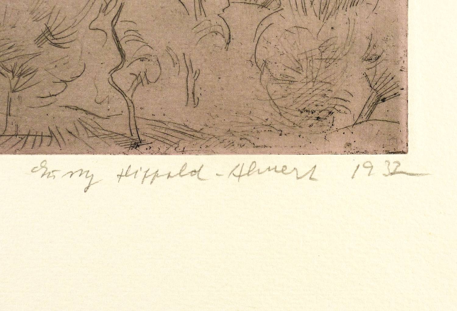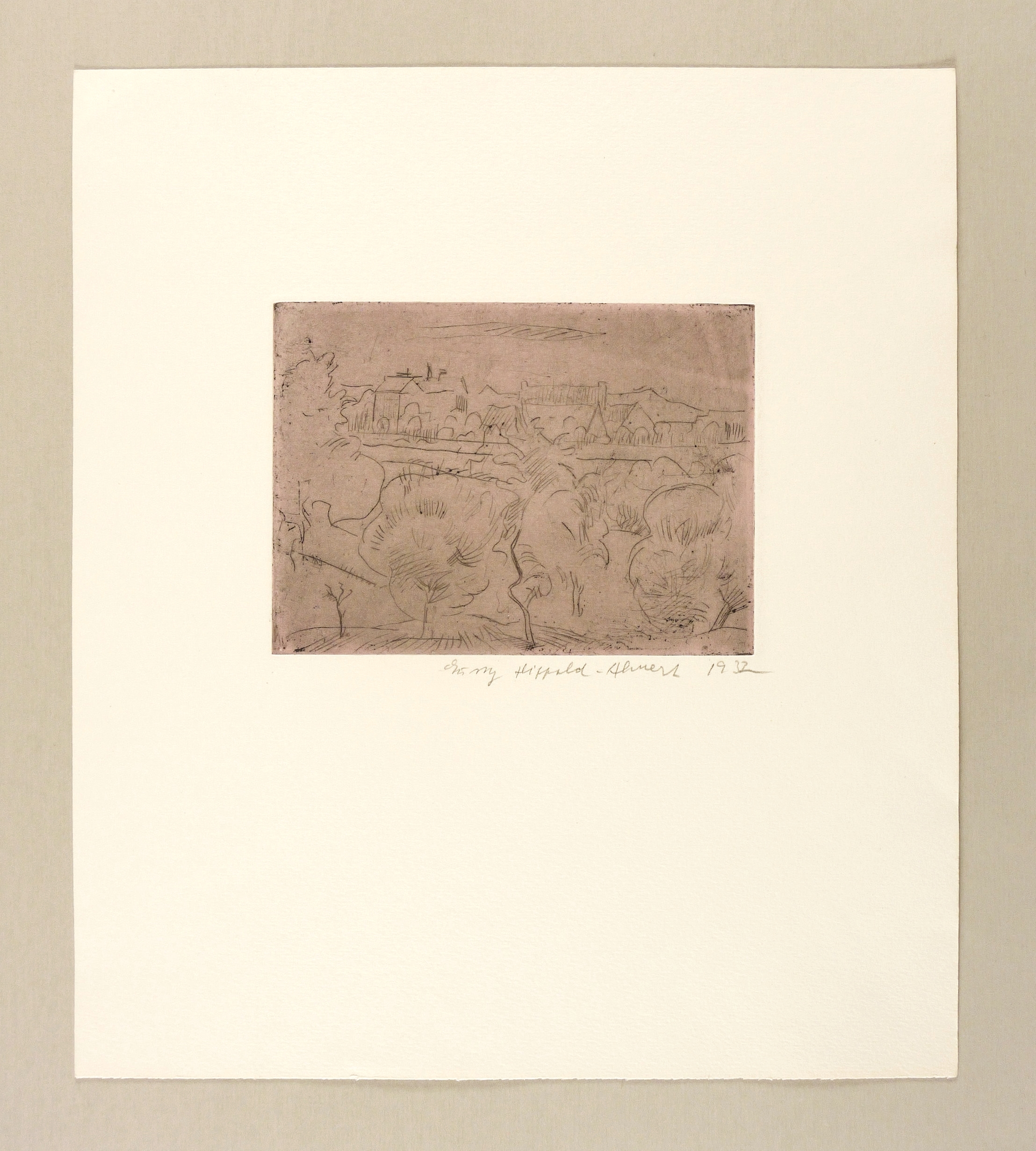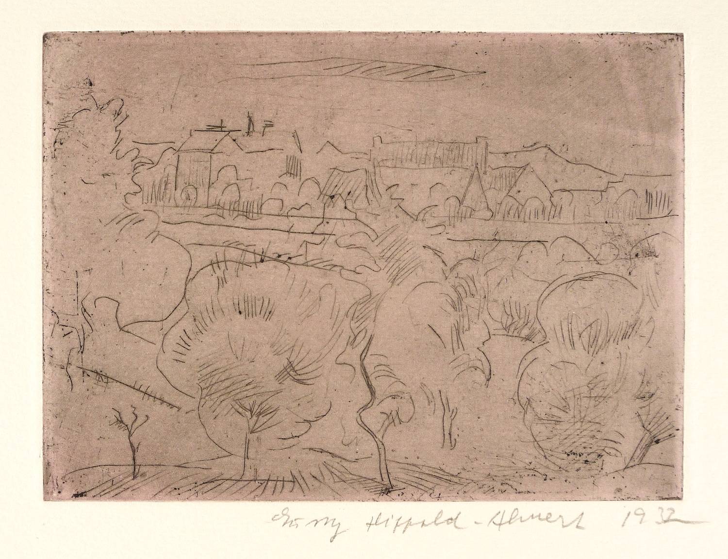 1932. Farbradierung / Kaltnadel, in Schwarz, mit Plattenton in Violett, auf hellchamois Weißenborn. – Originale Künstlergrafik, von Gussy Hippold-Ahnert. – 13,2 x 17,9 cm (Darstellung / Platte), 38 x 33 cm (Blatt).