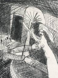 Hermann Naumann (1930 Kötzschenbroda-Radebeul - 2025 Dittersbach-Dürrröhrsdorf). Deutscher Maler, Grafiker und Bildhauer. 1946 Lehre als Steinmetz und Privatausbildung zum Plastiker bei Burkhart Ebe. 1947-49 Bildhauerlehre bei Herbert Volwahsen. 1950 Aufnahme in den Verband Bildender Künstler Deutschlands (VBKD) und Bezug des Ateliers im Künstlerhaus Dresden-Loschwitz. Seitdem freischaffend tätig. Gleichzeitig Beginn der Beschäftigung mit Malerei und Druckgrafik; erste Ölgemälde und Illustrationen zu Dostojewski. 1952 die berühmte Punzenstich-Folge zu Franz Kafka "Der Prozeß". 1969 Auszeichnung "Schönste Bücher der DDR" für die Illustrationen zu "Meine jüdischen Augen" beim Verlag Philipp Reclam jun. Leipzig. Ausstellungen: 1977 Kunsthalle Rostock, 1988 Stadtmuseum Bautzen, 2010, '13 und '22 Galerie Himmel Dresden.