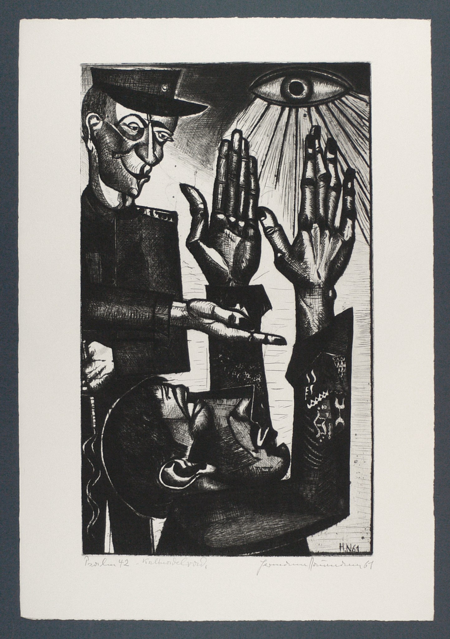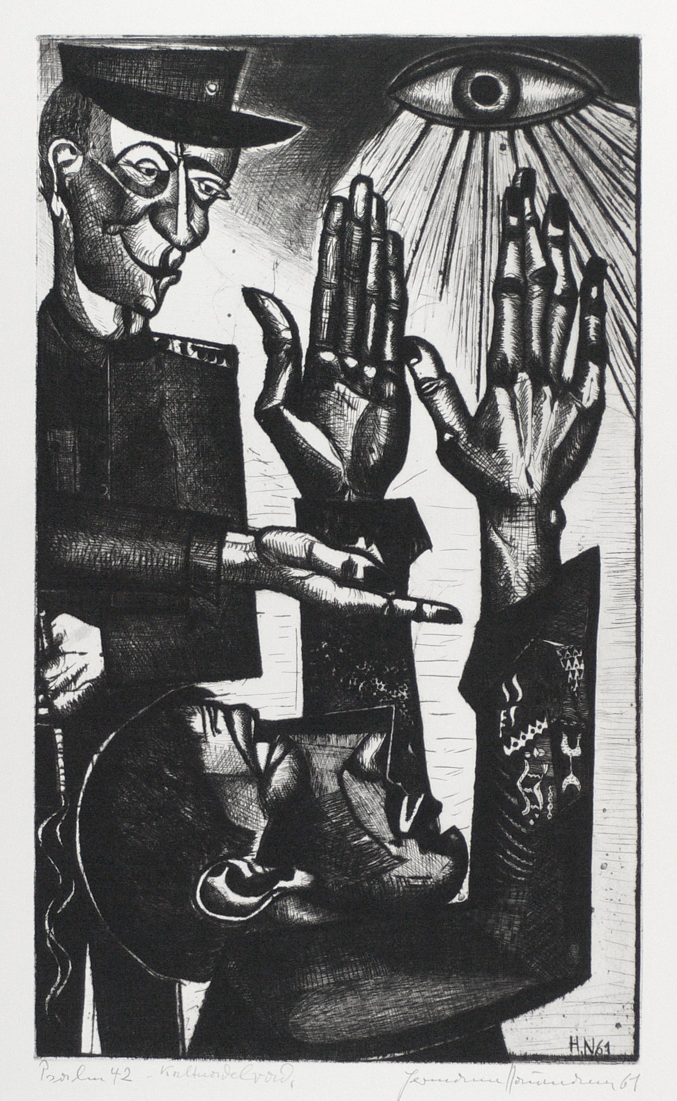 Hermann Naumann (1930 Kötzschenbroda-Radebeul - 2025 Dittersbach-Dürrröhrsdorf). Deutscher Maler, Grafiker und Bildhauer. 1946 Lehre als Steinmetz und Privatausbildung zum Plastiker bei Burkhart Ebe. 1947-49 Bildhauerlehre bei Herbert Volwahsen. 1950 Aufnahme in den Verband Bildender Künstler Deutschlands (VBKD) und Bezug des Ateliers im Künstlerhaus Dresden-Loschwitz. Seitdem freischaffend tätig. Gleichzeitig Beginn der Beschäftigung mit Malerei und Druckgrafik; erste Ölgemälde und Illustrationen zu Dostojewski. 1952 die berühmte Punzenstich-Folge zu Franz Kafka "Der Prozeß". 1969 Auszeichnung "Schönste Bücher der DDR" für die Illustrationen zu "Meine jüdischen Augen" beim Verlag Philipp Reclam jun. Leipzig. Ausstellungen: 1977 Kunsthalle Rostock, 1988 Stadtmuseum Bautzen, 2010, '13 und '22 Galerie Himmel Dresden.