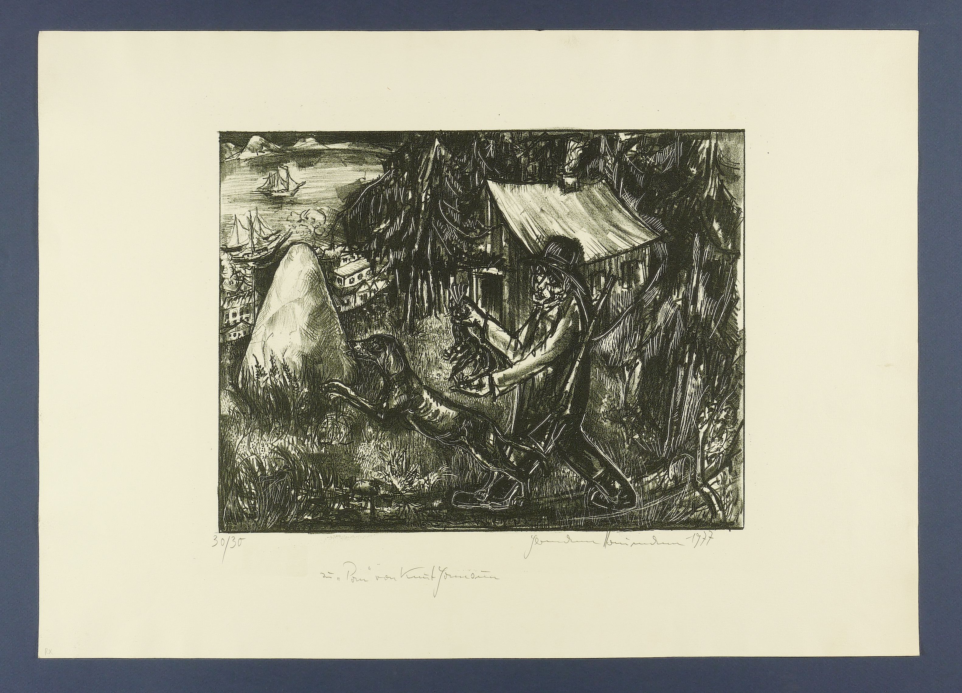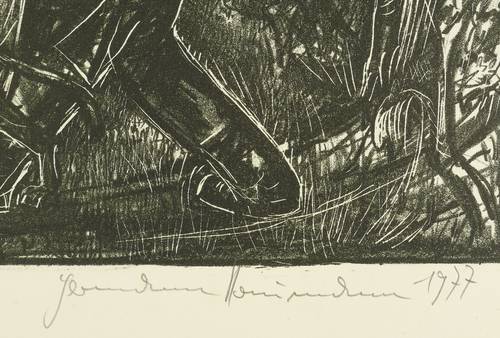 Außerhalb der Darstellung in Bleistift rechts unten signiert und datiert, links unten mit eigenhändiger Auflagenbezeichnung versehen und mittig betitelt. Im Stein unten links Trockenstempel: ″HANDPRESSENDRUCK - SCHREITER-PRESSE DRESDEN″. – Papier leicht gegilbt. Gut erhalten.