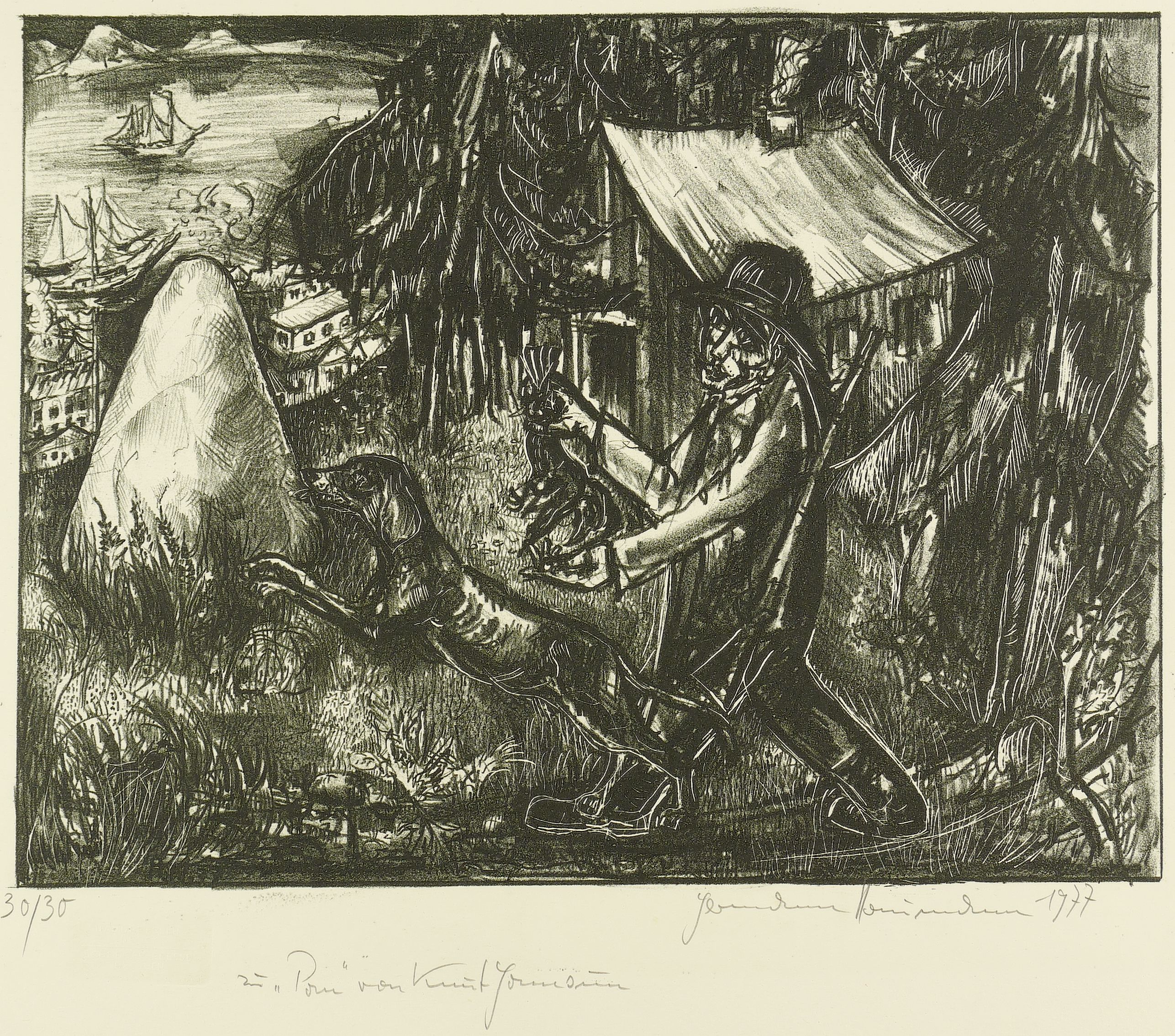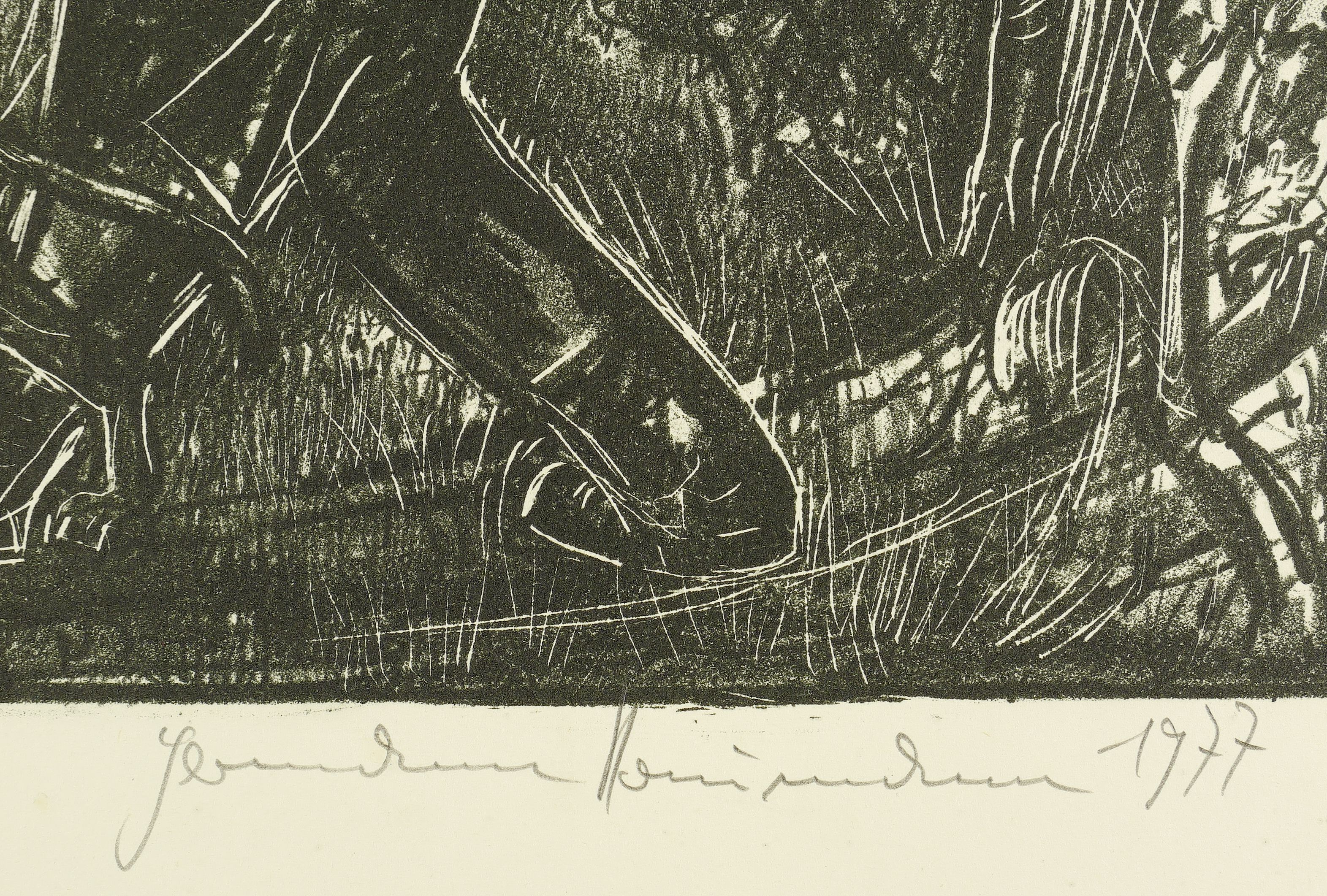 1977. Lithografie / Kreidelithografie, partiell geschabt, in Schwarz, auf gelblichem Velin. – Originale Künstlergrafik, von Hermann Naumann. – Auflage Exemplar Nr. 30/30. – 29,8 x 39,0 cm (Darstellung), 36,0 x 42,5 cm (Stein), 46 x 65 cm (Blatt).