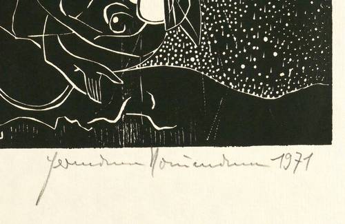 1971. Holzschnitt, in Schwarz, auf grobfasrigem Büttenpapier. – Originale Künstlergrafik, von Hermann Naumann. – 40,0 x 24,8 cm (Darstellung / Druckstock), 63 x 46 cm (Blatt).